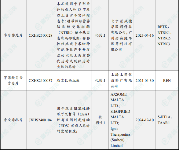 北京诺诚健华的 卓乐替尼片 获批上市,适用于下列条件的成人和12岁及以上青少年实体瘤患者:携带神经营养酪氨酸受体激酶(NTRK)融合基因;患有局部晚期、转移性疾病或手术切除可能导致严重并发症的以及;无满意替代治疗或既往治疗失败的患者。公开资料显示,卓乐替尼是新一代泛TRK抑制剂,其核心优势在于能够有效解决第一代TRK抑制剂(如拉罗替尼、恩曲替尼)的耐药性问题。