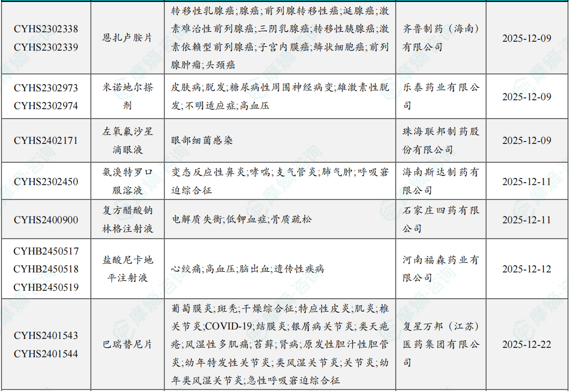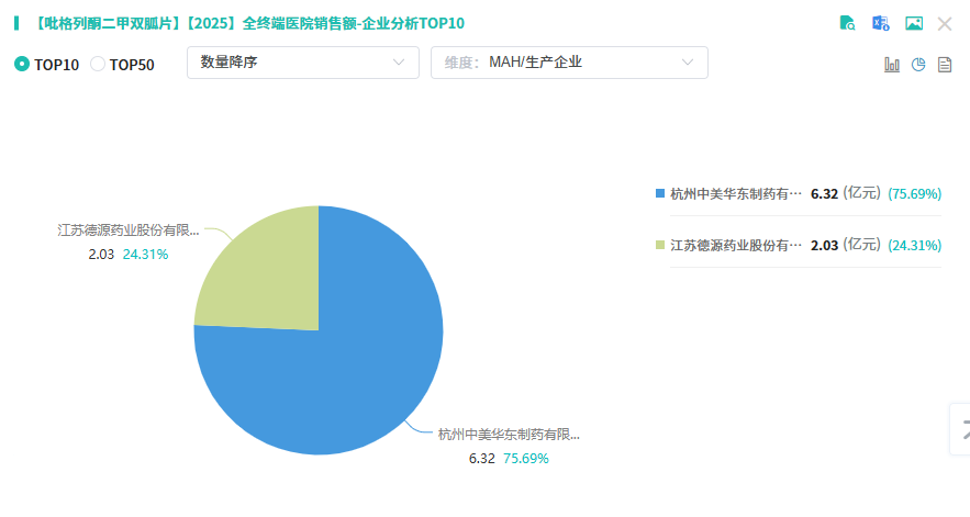 12月11日,北京北陆药业股份有限公司和安徽杰玺医药有限公司的吡格列酮二甲双胍片视同通过一致性评价,过评总企业数达到了8家。吡格列酮二甲双胍片是双胍类与噻唑烷二酮类复方降糖药,主要用于治疗2型糖尿病,通过二甲双胍减少肝糖输出、改善胰岛素抵抗,以及吡格列酮增强胰岛素敏感性的协同作用,有效控制血糖水平。吡格列酮二甲双胍片2025年上半年在医院端销售额达8.34亿元,杭州中美华东制药有限公司以6.32亿元的销售额占据76%的市场。