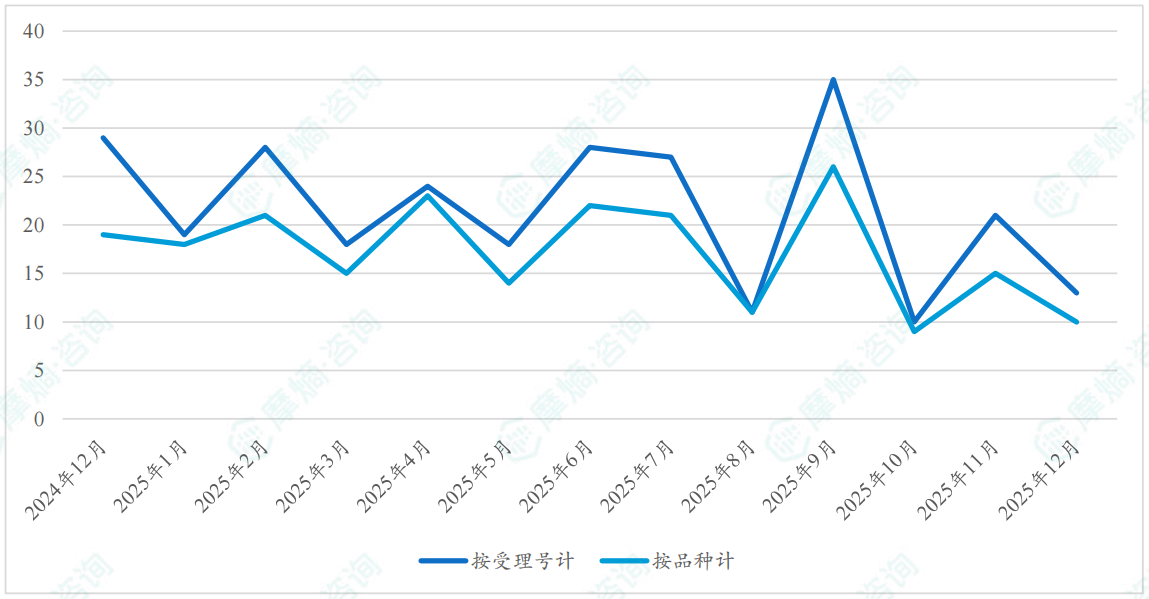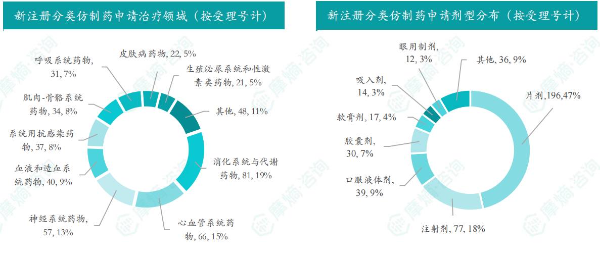 根据摩熵医药数据库统计,2025年12月期间共有421项(共计241个品种)新注册分类仿制药申请获CDE承办,其中新注册分类临床申请28项,新注册分类上市申请393项。