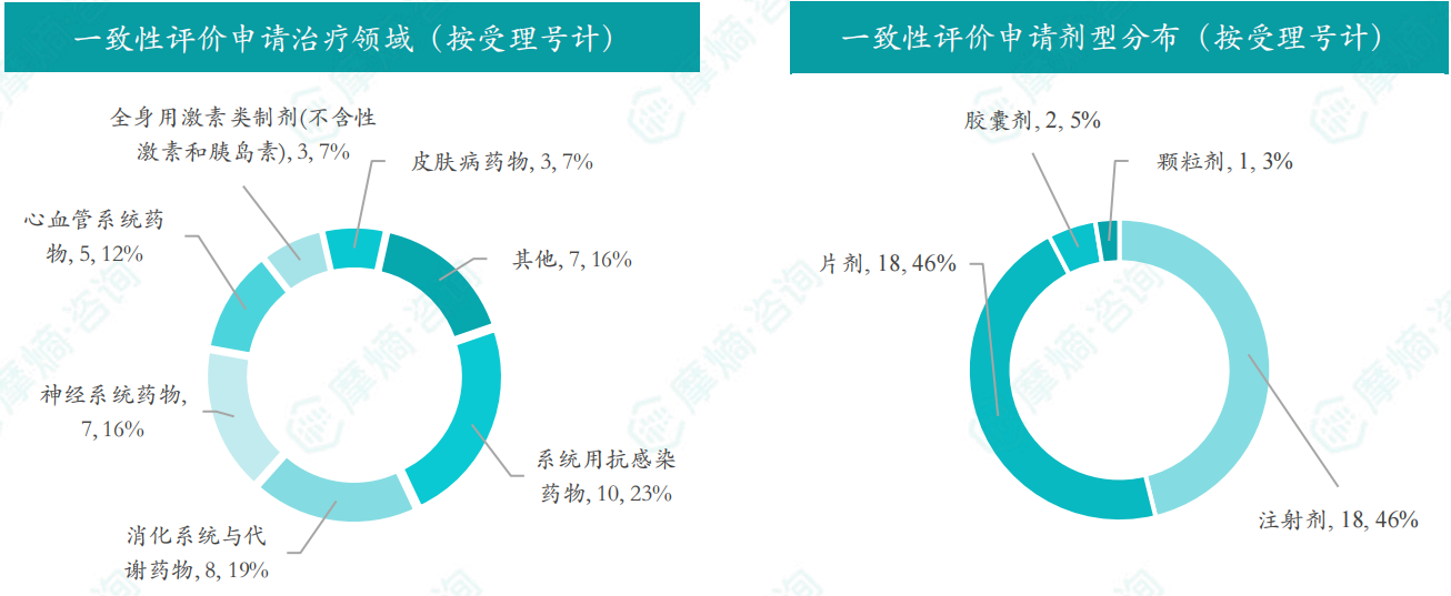 - 申请品种主要为系统用抗感染药物,申请剂型主要为注射剂与片剂;