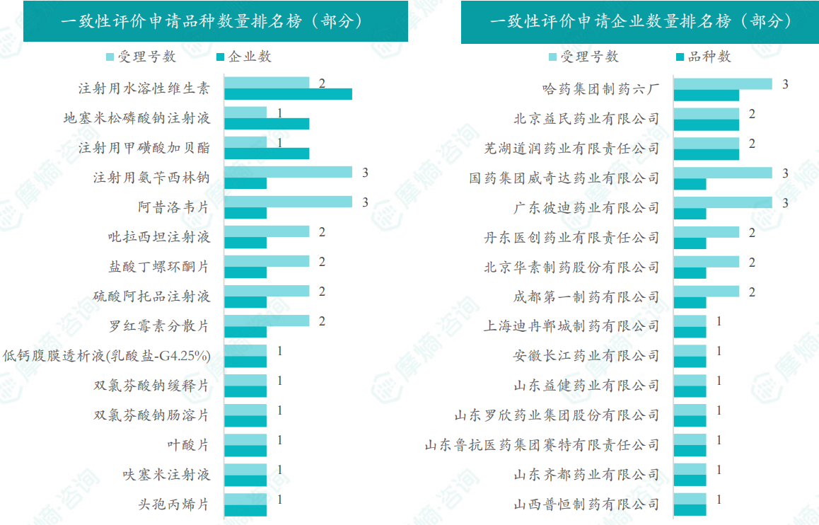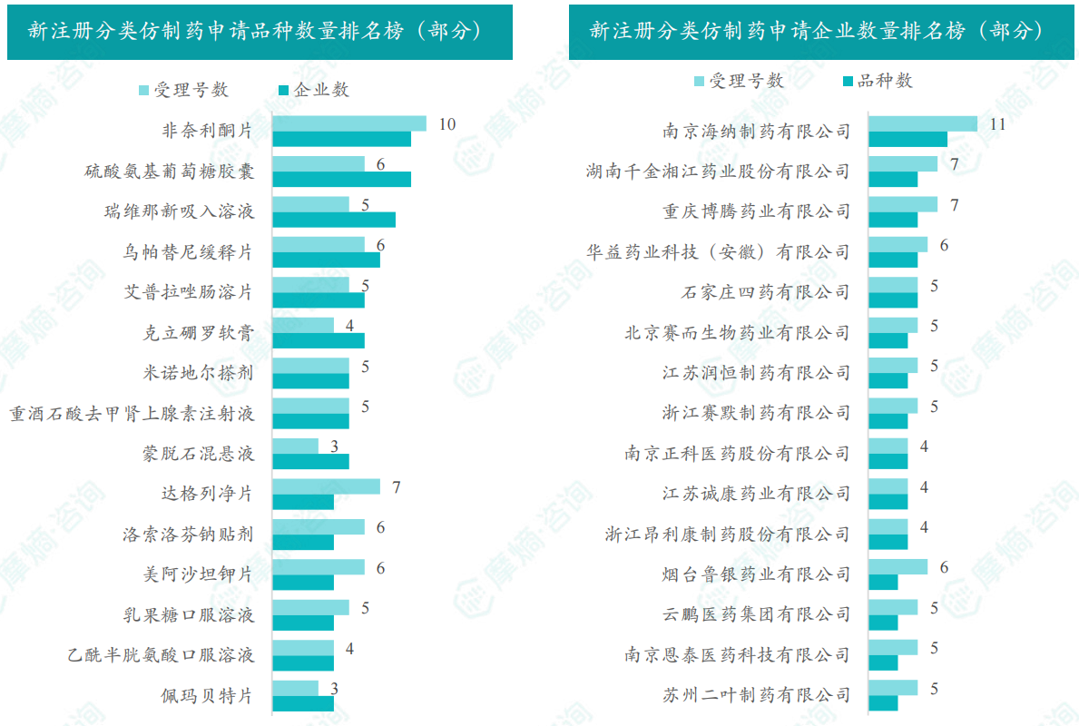 注射用氨苄西林钠和阿昔洛韦片为受理号最多的品种,各有3个;哈药集团制药六厂、北京益民药业有限公司和芜湖道润药业有限责任公司为申请品种最多的企业,各有2个品种。