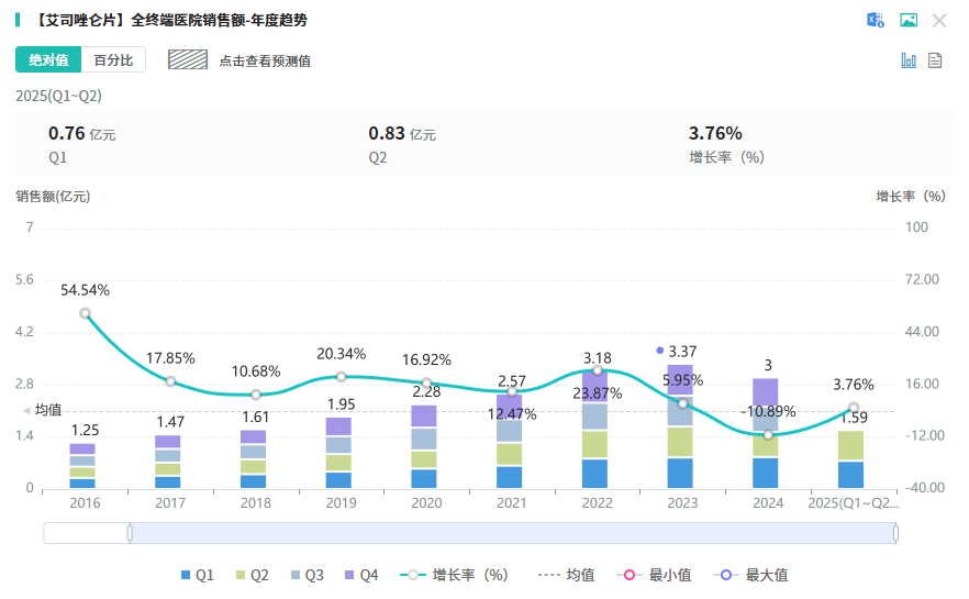 12月3日,新乡市常乐制药有限责任公司的艾司唑仑片通过一致性评价,过评总企业数达到了7家。艾司唑仑片是苯二氮䓬类镇静催眠药,主要用于治疗失眠、焦虑、紧张及恐惧,还可缓解癫痫、惊厥发作。艾司唑仑片2025年上半年在医院端销售额达1.59亿元,山东信谊制药有限公司和华中药业股份有限公司分别占据33%和31%的市场。