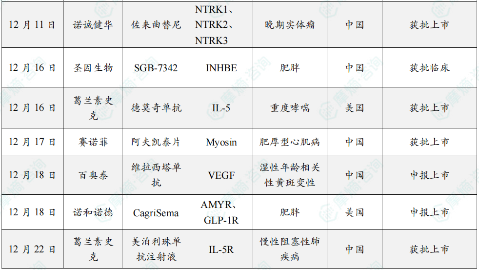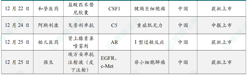 12月国内新药获批临床情况