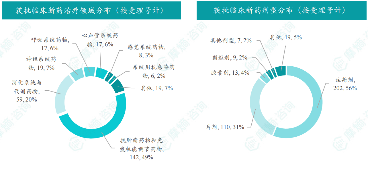 12月获批临床受理号数量最多的新药为抗肿瘤药和免疫机能调节药物,有142个,占比49%,消化系统与代谢药物获批数量也比较多,有59个。获批剂型主要为注射剂与片剂,分别有202个,110个。