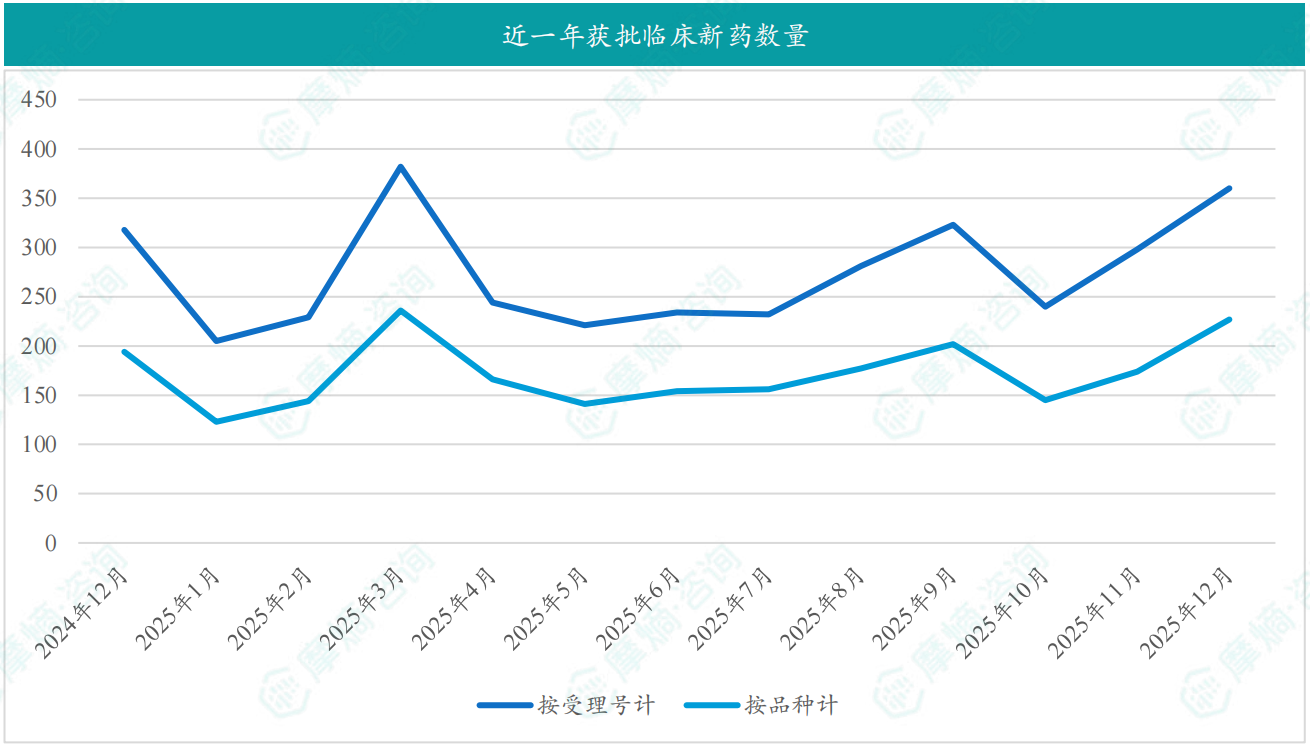 根据摩熵医药数据库统计,2025年12月共有227款新药获批临床(共计360个受理号),较上个月增加了53款,其中包括94款化药,116款生物制品,17款中药。