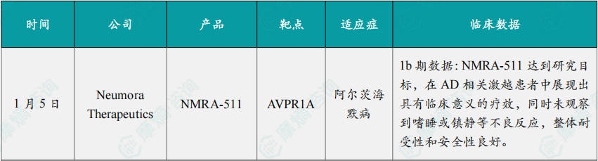 1月5日,Neumora Therapeutics宣布,其口服、可穿越血脑屏障的在研血管升压素1a受体(V1aR)拮抗剂 NMRA-511 在阿尔茨海默病相关激越(AD agitation)患者中开展的1b期信号探索性研究取得积极结果。