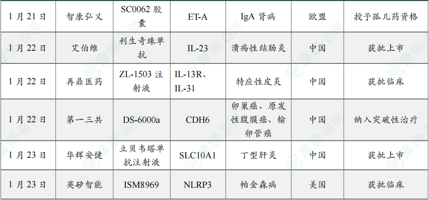 1月23日,NMPA官网显示,国家药品监督管理局通过优先审评审批程序附条件批准华辉安健(北京)生物科技有限公司申报的 立贝韦塔单抗注射液(商品名:华优诺)上市,用于治疗伴有或不伴有代偿期肝硬化的慢性丁型肝炎病毒(HDV)感染成年患者。