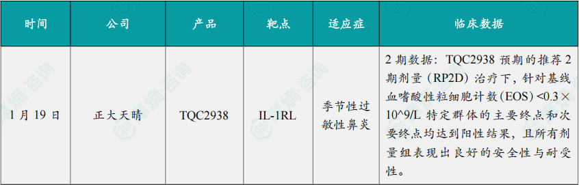 1月19日,正大天晴宣布其自主研发的 TQC2938(ST2单抗)已完成针对季节性过敏性鼻炎(SAR)的2期临床试验。研究结果显示,TQC2938 预期的推荐2期剂量(RP2D)治疗下,针对基线血嗜酸性粒细胞计数(EOS)<0.3×10^9/L特定群体的主要终点和次要终点均达到阳性结果,且所有剂量组表现出良好的安全性与耐受性。