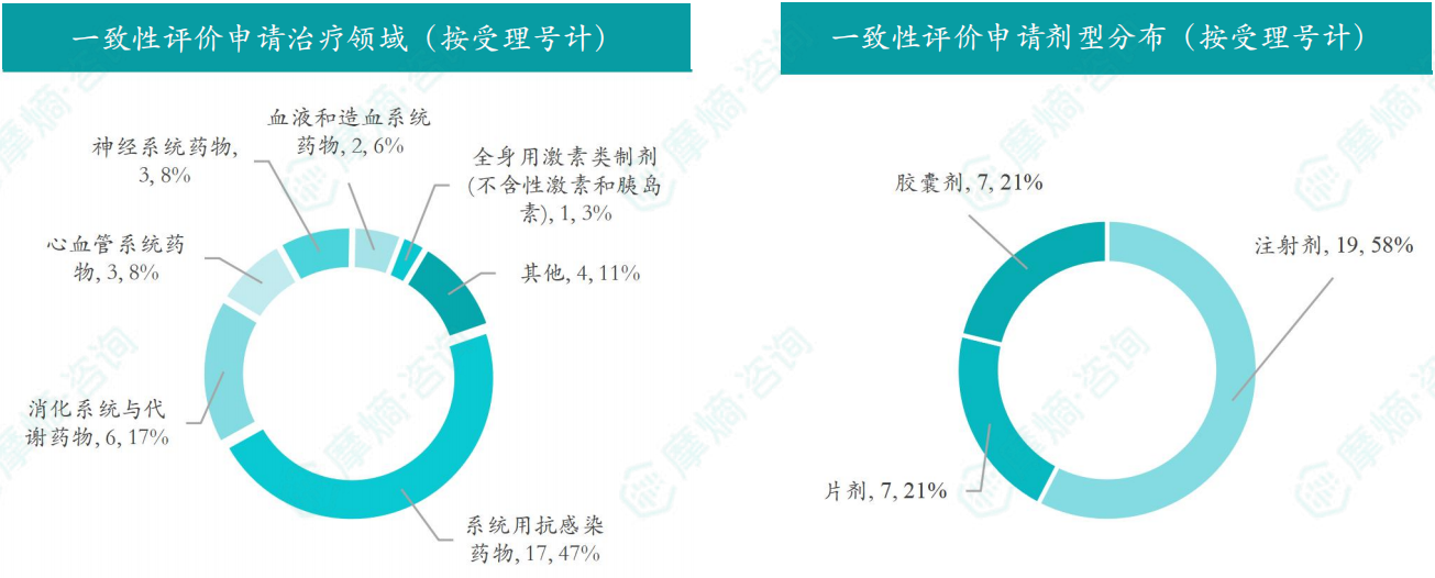 根据摩熵医药数据库统计,2026年1月共有20个品种(按受理号计33项)一致性评价申请获CDE承办,申请品种主要为系统用抗感染药物,申请剂型主要为注射剂。