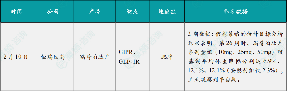 2月10日,恒瑞医药与Kailera Therapeutics共同宣布,每日1次口服 瑞普泊肽片 在中国166名肥胖成人中开展的II期临床试验(HRS9531-T-201)取得积极顶线数据。基于令人鼓舞的临床数据,恒瑞医药将在中国推进 瑞普泊肽片 进入III期试验,合作方Kailera计划于2026年启动全球II期试验。