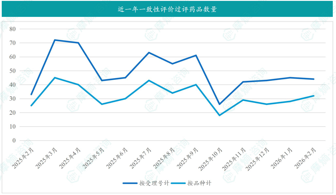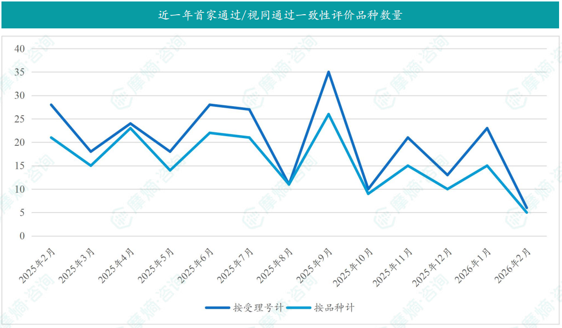 根据摩熵医药数据库统计,2026年2月期间共有116个(共计183个受理号)品种通过/视同通过一致性评价,其中一致性评价过评品种数量32个,视同通过一致性评价品种数量88个。