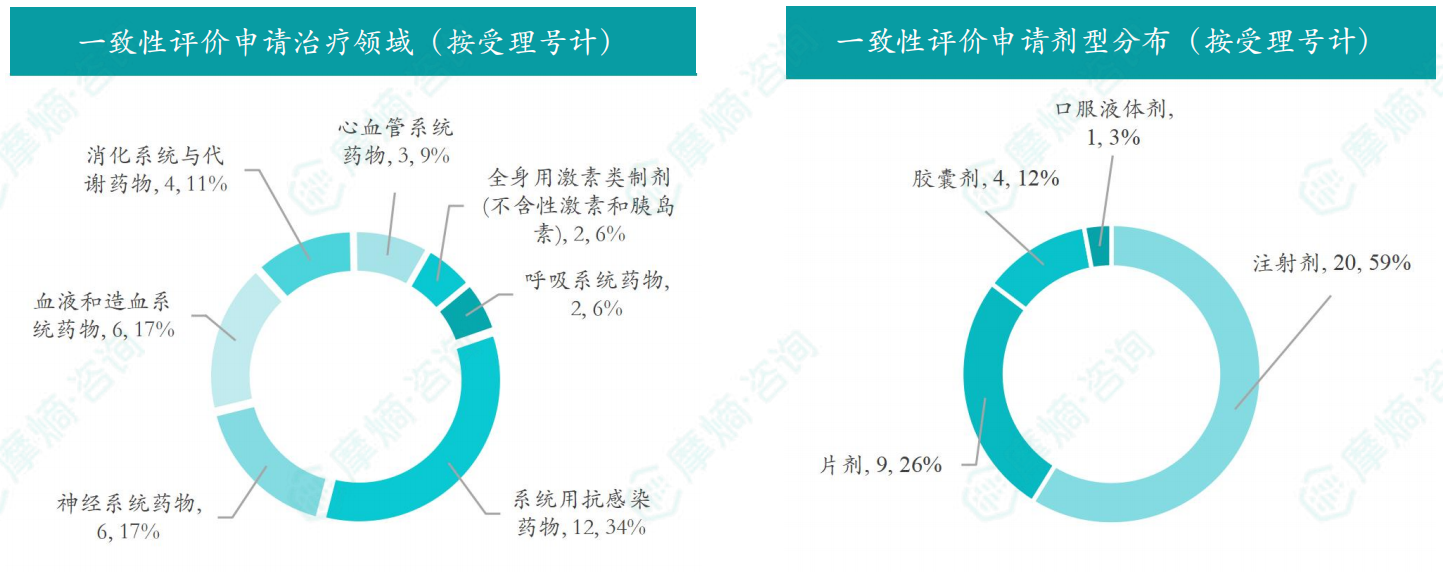 根据摩熵医药数据库统计,2026年2月共有24个品种(按受理号计34项)一致性评价申请获CDE承办,申请品种主要为系统用抗感染药物,申请剂型主要为注射剂。