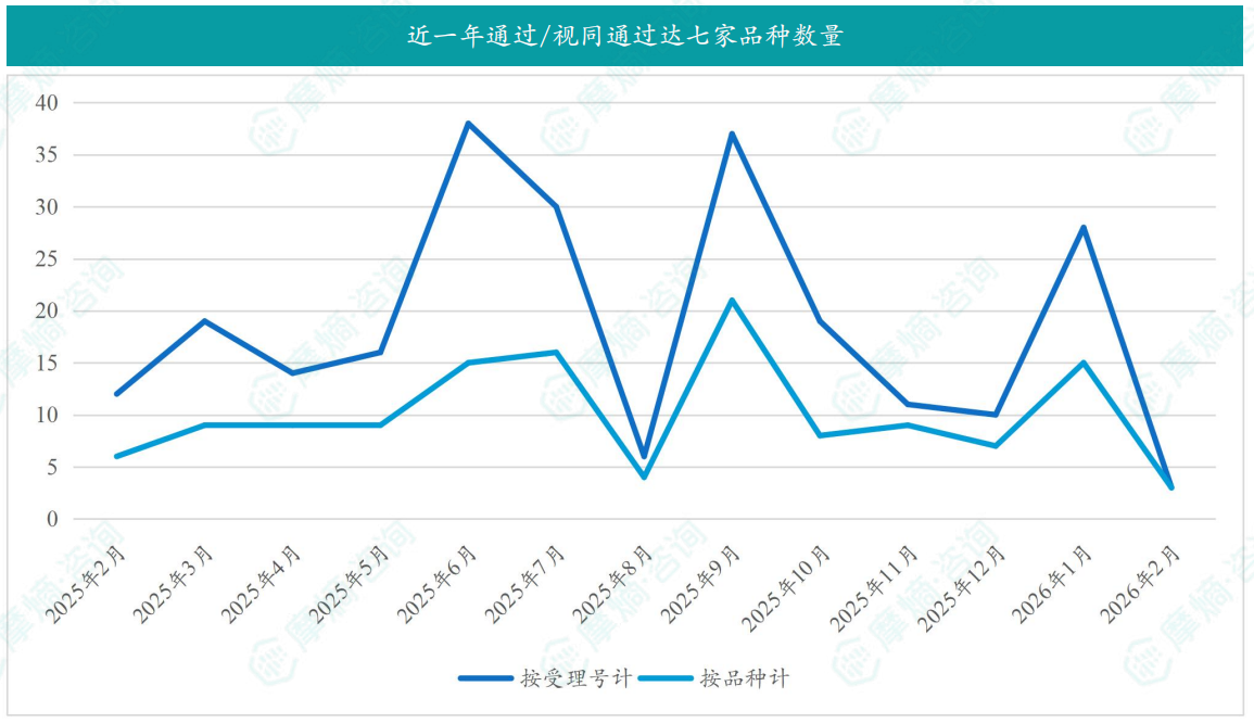 根据摩熵医药数据库统计,2026年2月期间共有3个(共计3个受理号)品种一致性评价达七家过评。2月4日,成都天台山制药股份有限公司的醋酸曲普瑞林注射液通过一致性评价,过评总企业数达到了7家。