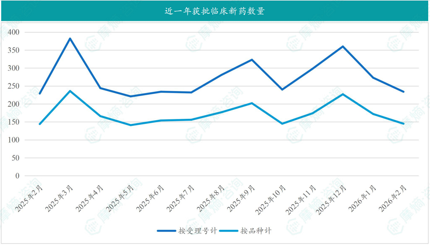 根据摩熵医药数据库统计,2026年2月共有145款新药获批临床(共计234个受理号),较上个月减少了27款,其中包括63款化药,77款生物制品,5款中药。