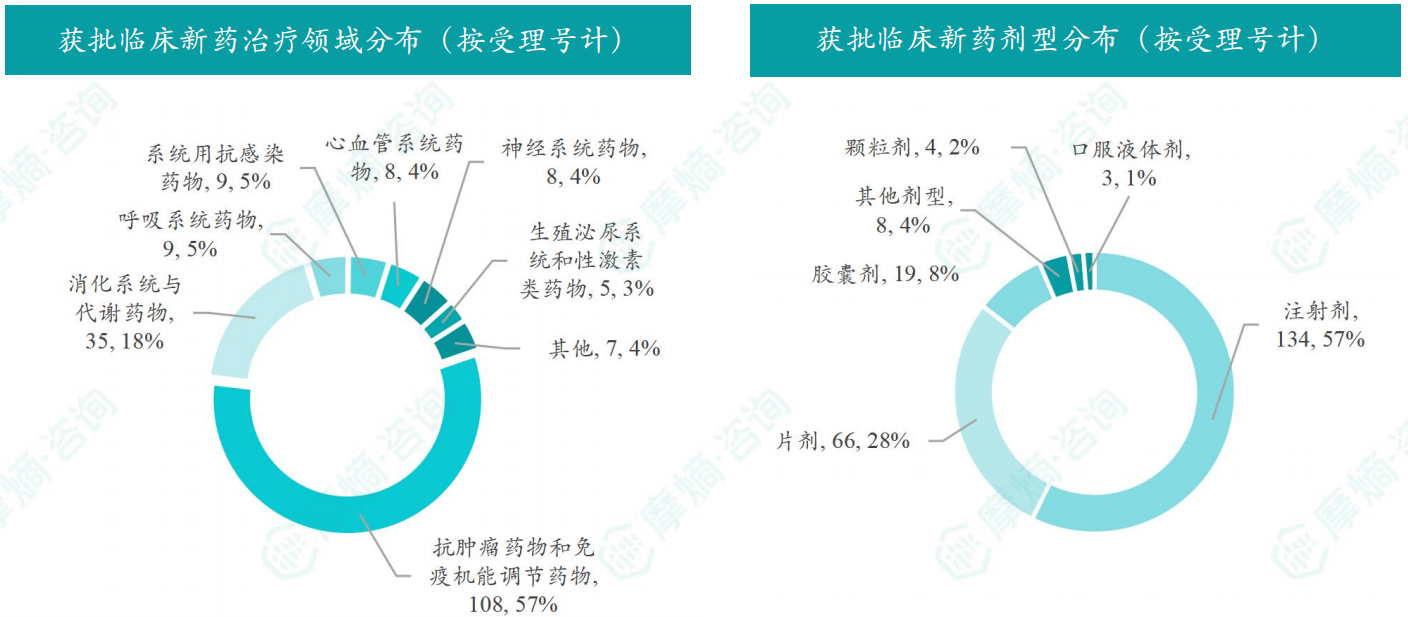 本月获批临床受理号数量最多的新药为抗肿瘤药和免疫机能调节药物,有108个,占比57%,消化系统与代谢药物获批数量也比较多,有35个。获批剂型主要为注射剂与片剂,分别有134个,66个。