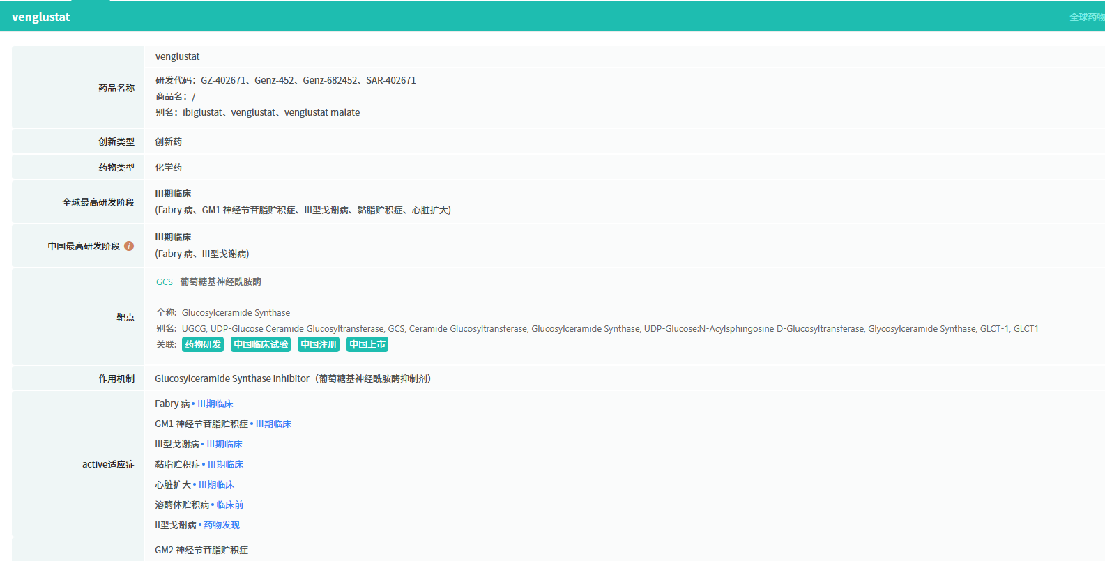 Venglustat 是一种新型的口服葡萄糖神经酰胺合成酶抑制剂(GCSi),能够强效抑制N端甲基转移酶1(NTMT1),并且能够穿越血脑屏障,有潜力通过抑制异常鞘糖脂(GSLs)积累及其生理病理后果,延缓相关疾病的进展。