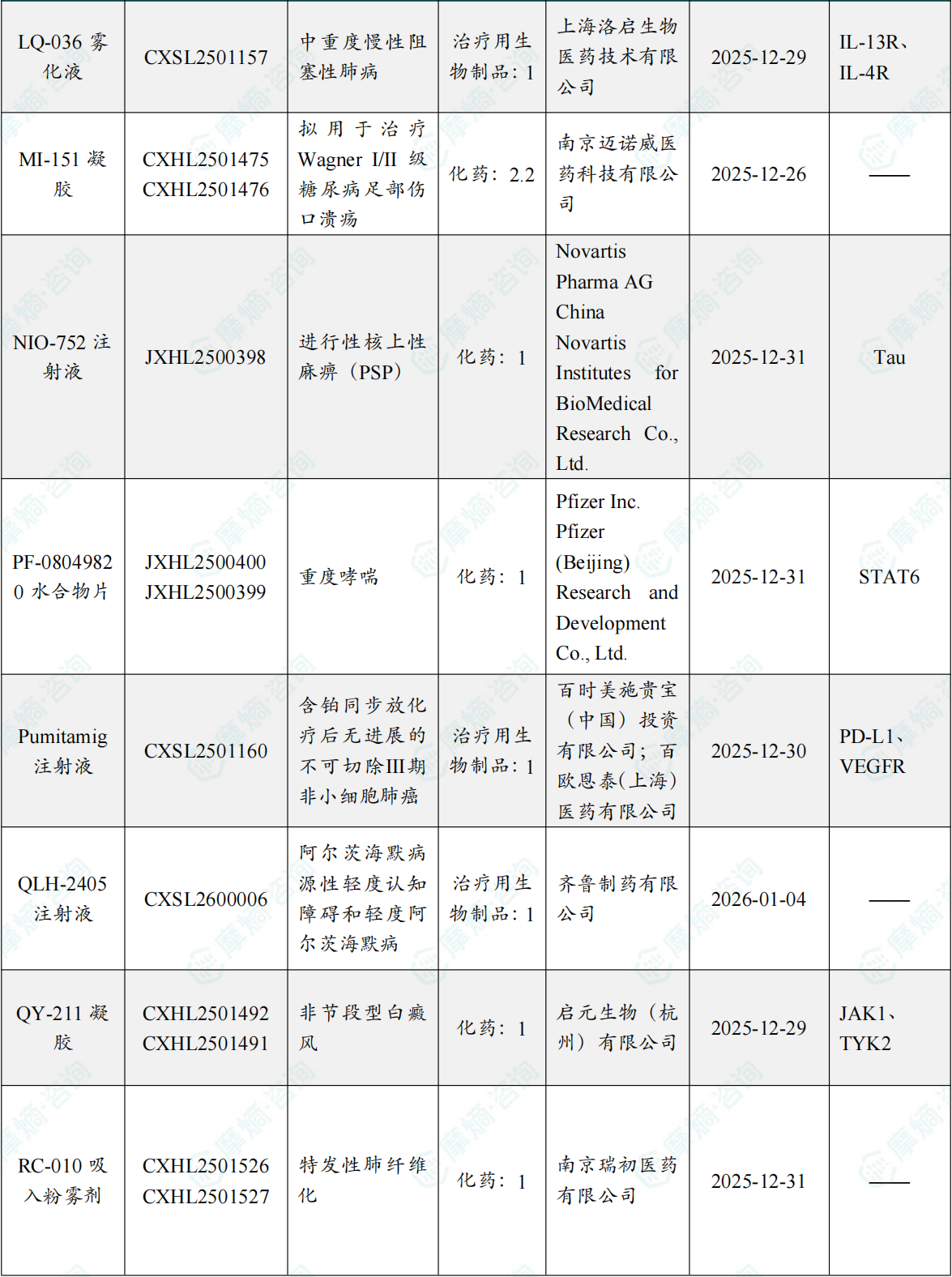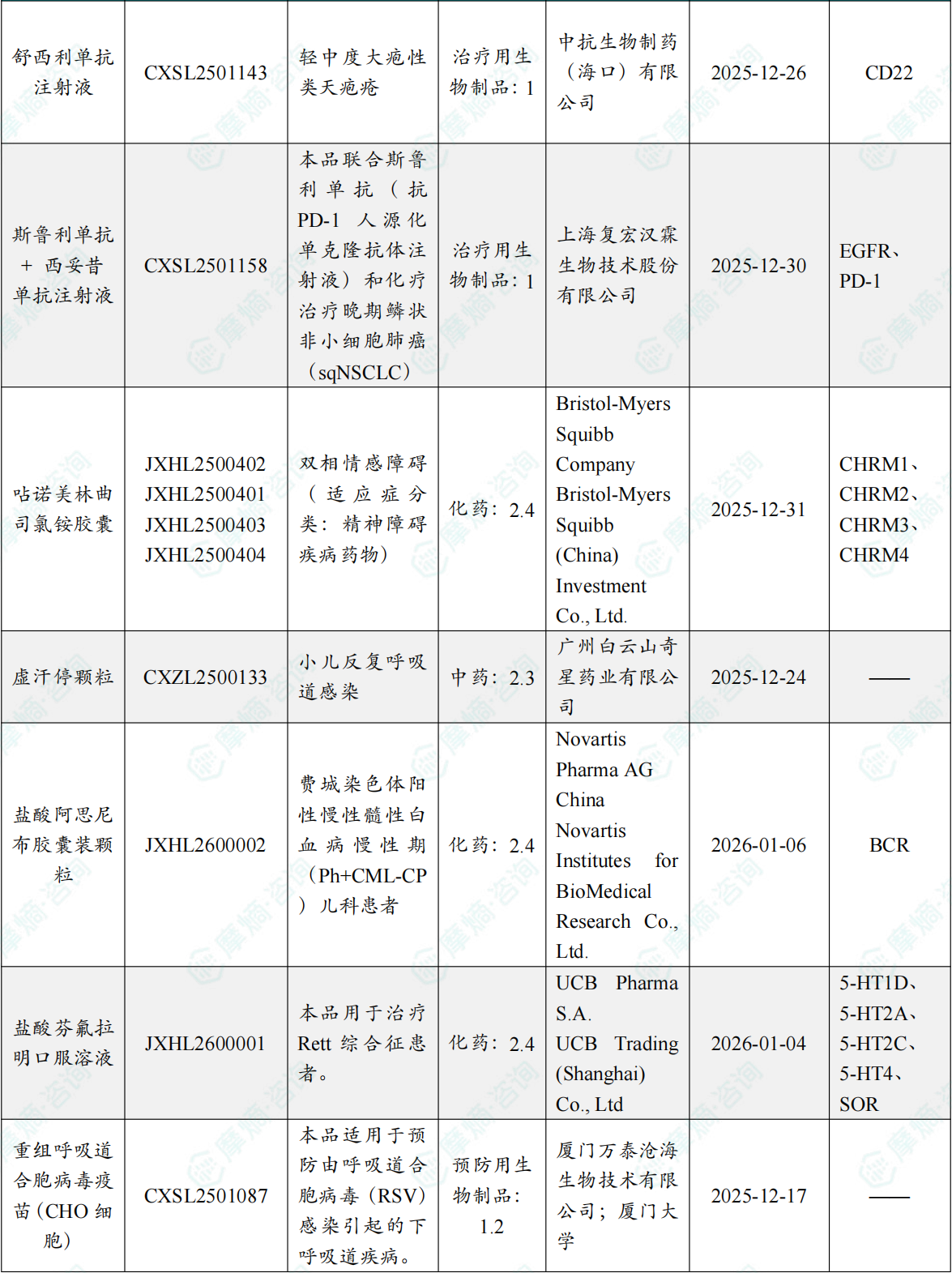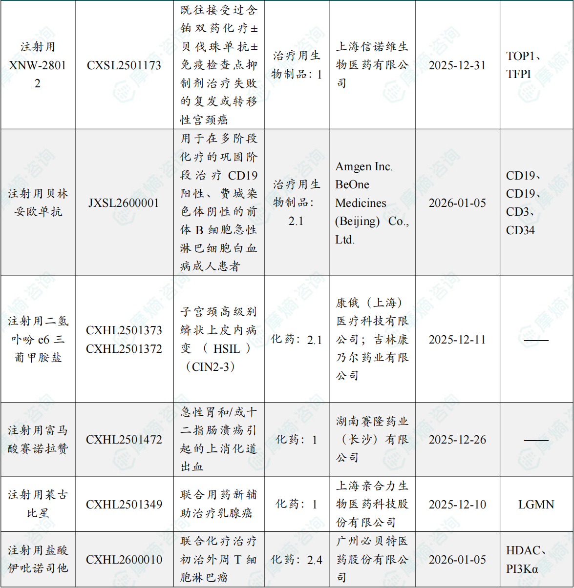 备注:(1)此处未包括补充申请之情形;(2)此处所列创新药/改良型新药,主要是指CDE受理批准的1类、2类、5.1类以及生物制品3.1类和3.2类。(3)更多获批临床信息及研发进展详情及相关靶点全局分析等,可通过摩熵中国药品审评数据库获取并下载EXCEL表格。
