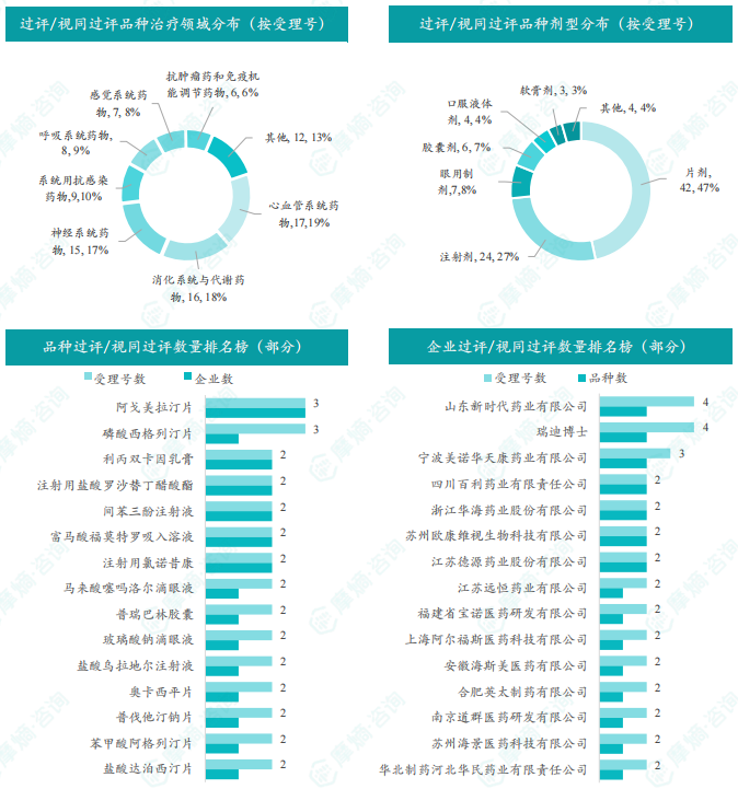 本周过评/视同过评品种主要为心血管系统药物,过评/视同过评产品剂型主要为片剂;本周阿戈美拉汀片和磷酸西格列汀片过评/视同过评受理号数量最多有3个,同时阿戈美拉汀片也是本周过评/视同过评企业数最多的品种;本周山东新时代药业有限公司、瑞迪博士和宁波美诺华天康药业有限公司等多家企业过评/视同过评品种数高达2种,其余各企业过评/视同过评品种数紧随其后,本周过评/视同过评企业共包括山东新时代药业有限公司、瑞迪博士和宁波美诺华天康药业有限公司等68家企业。