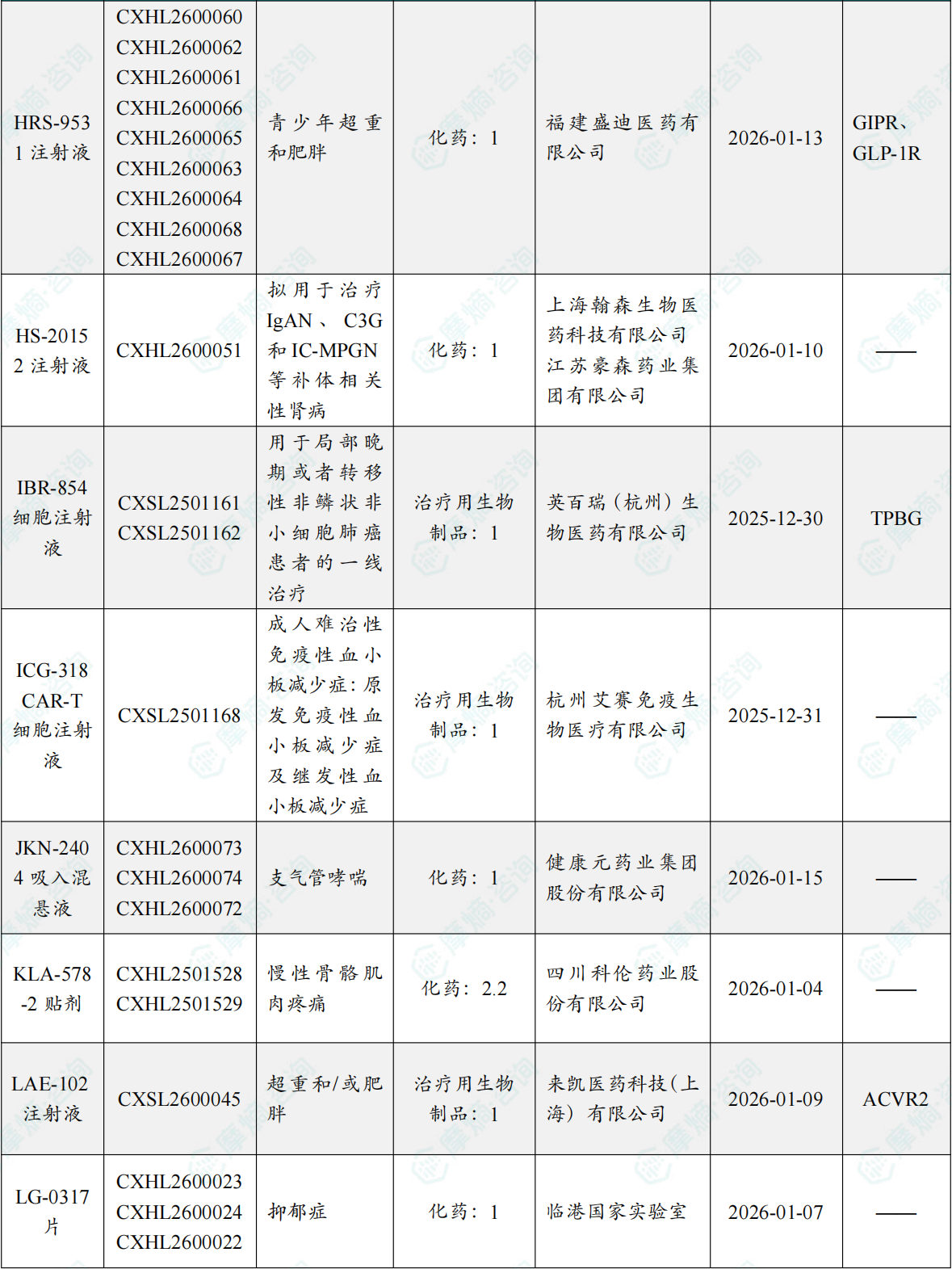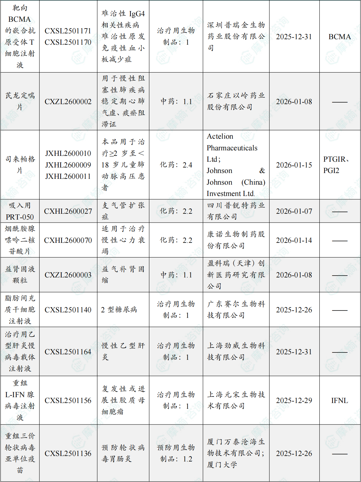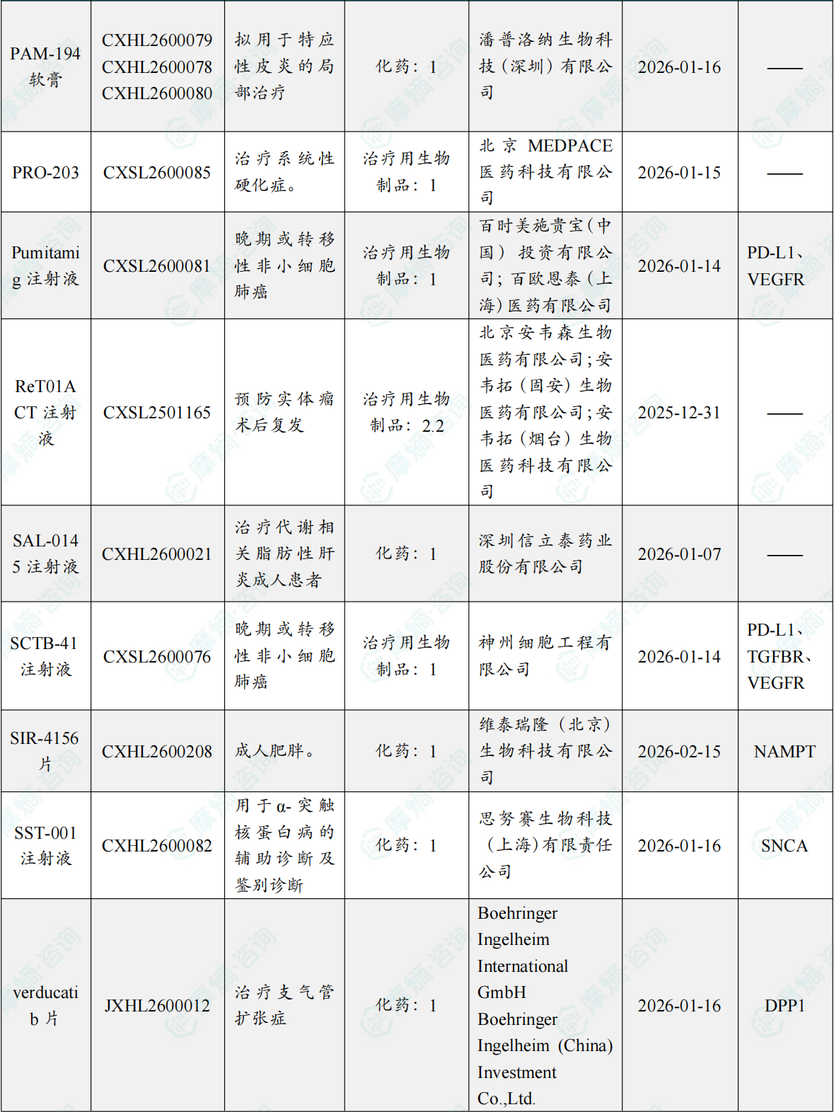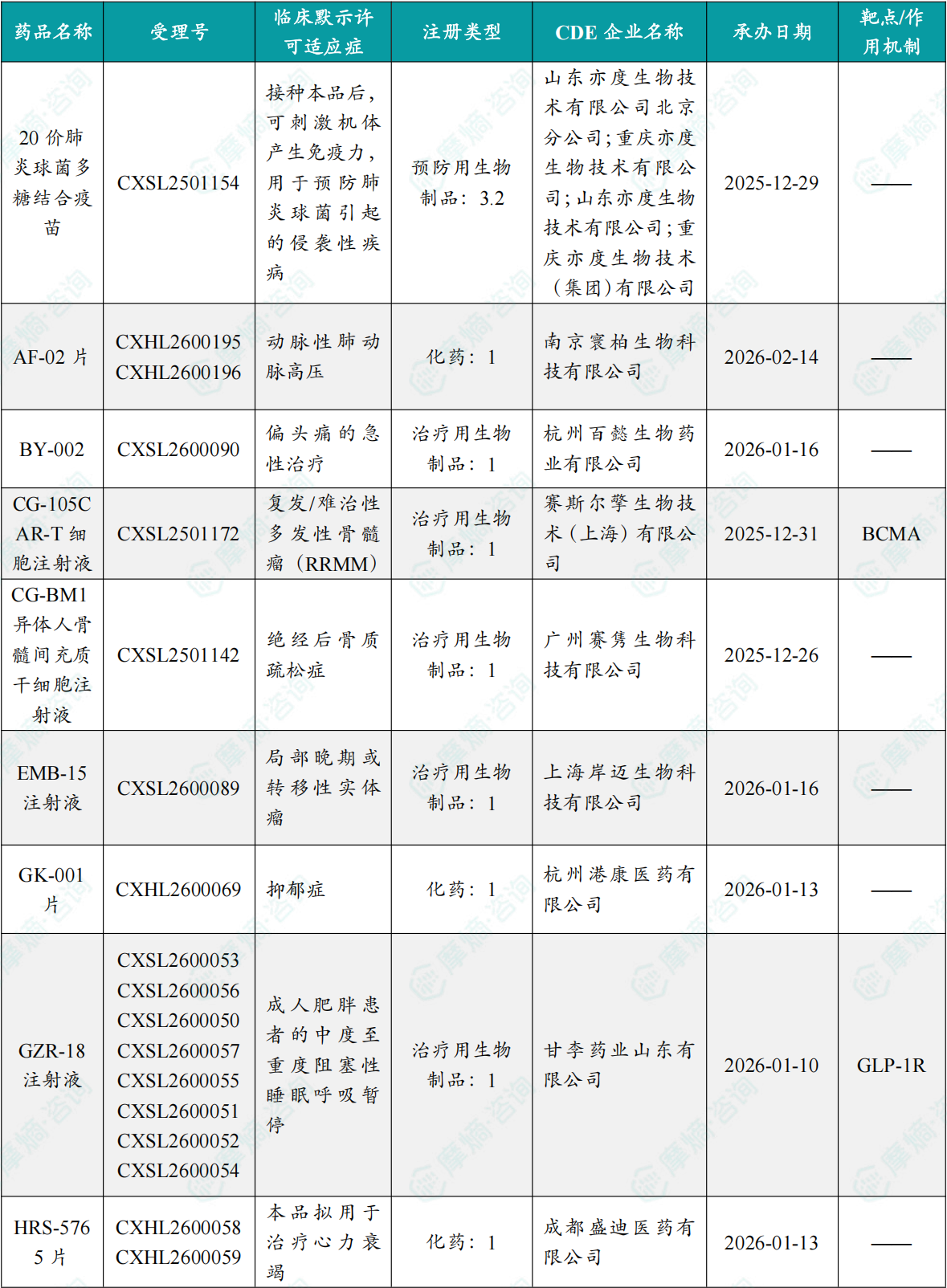 备注:(1)此处未包括补充申请之情形;(2)此处所列创新药/改良型新药,主要是指CDE受理批准的1类、2类、5.1类以及生物制品3.1类和3.2类。(3)更多获批临床信息及研发进展详情及相关靶点全局分析等,可通过摩熵中国药品审评数据库获取并下载EXCEL表格。