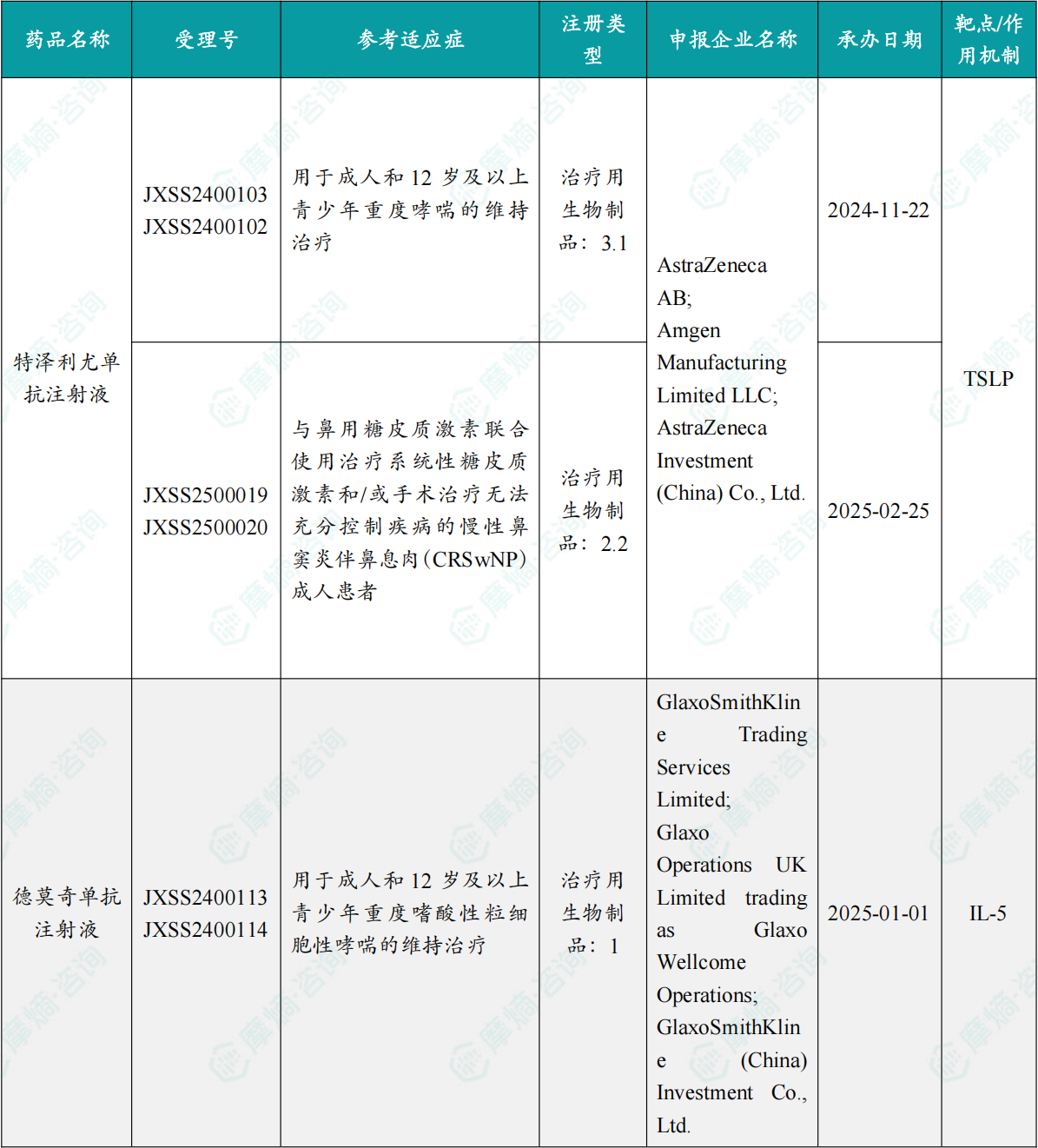 2026年3月27日,国家药品监督管理局发布药品批准证明文件通知:国家药品监督管理局批准阿斯利康申报的特泽利尤单抗注射液上市,该品种本次该药获批2个适应症,分别是用于成人和12岁及以上青少年重度哮喘的维持治疗和与鼻用糖皮质激素联合使用治疗系统性糖皮质激素和/或手术治疗无法充分控制疾病的慢性鼻窦炎伴鼻息肉(CRSwNP)成人患者。公开资料显示,是一种同类首创的人类单克隆抗体,可抑制TSLP的作用。TSLP是一种关键的上皮细胞因子,位于多个炎症级联的顶端,与严重哮喘和其他炎症疾病相关的过敏性、嗜酸性和其他类型内皮炎症息息相关。