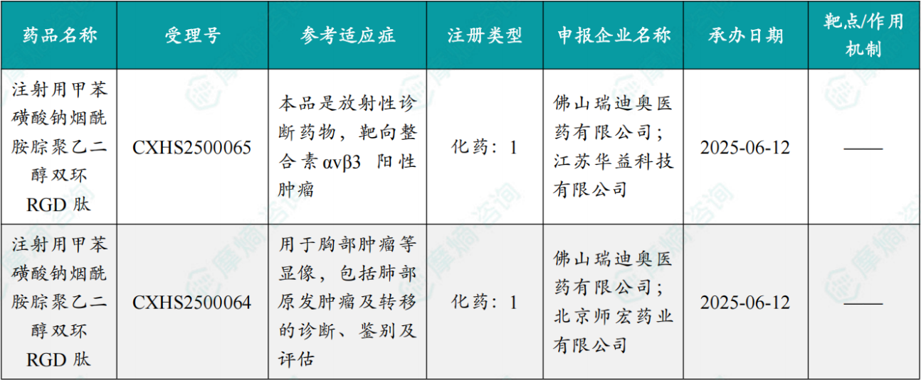 2026年4月3日,国家药品监督管理局发布药品批准证明文件通知:国家药品监督管理局批准佛山瑞迪奥医药有限公司申报的注射用甲苯磺酸钠烟酰胺腙聚乙二醇双环RGD肽上市,本品仅用于制备锝[99mTc]肼基烟酰胺聚乙二醇双环RGD 肽注射液,所制得注射液是放射性诊断药物,靶向整合素αvβ3 阳性肿瘤,采用SPECT(/CT)显像,主要用于胸部肿瘤等显像,包括肺部原发肿瘤及转移的诊断、鉴别及评估。