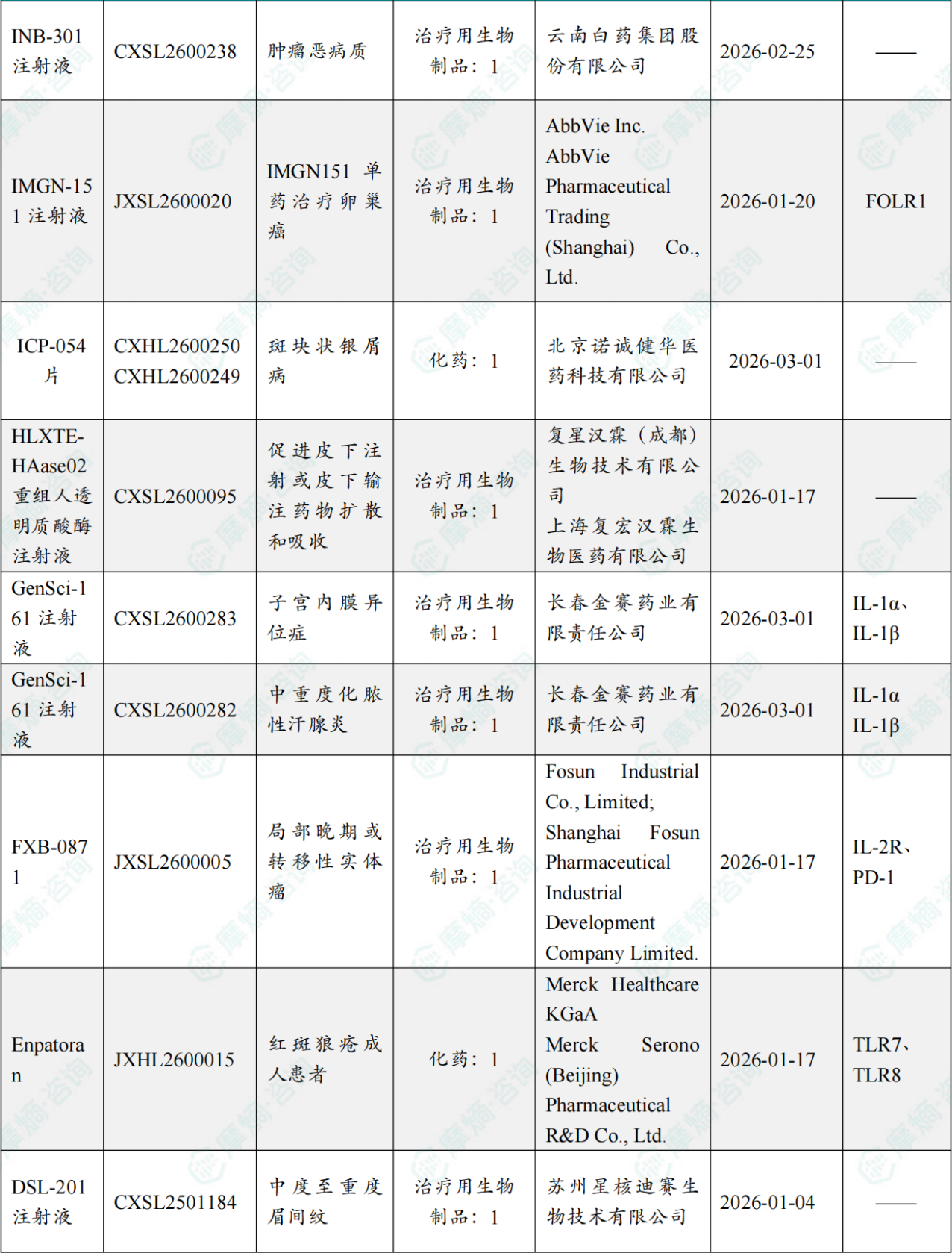 备注:(1)此处未包括补充申请之情形;(2)此处所列创新药/改良型新药,主要是指CDE受理批准的1类、2类、5.1类以及生物制品3.1类和3.2类。(3)更多获批临床信息及研发进展详情及相关靶点全局分析等,可通过摩熵中国药品审评数据库获取并下载EXCEL表格。