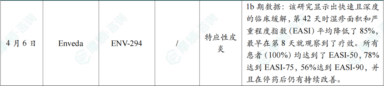 4月6日,Enveda公司公布了其潜在“first-in-class”、每日一次口服在研疗法ENV-294,在中重度特应性皮炎(AD)患者中进行的1b期临床试验的积极结果。这项开放标签研究纳入了9名曾接受过系统性治疗的成人患者,所有患者均接受了为期28天的每日一次800 mg ENV-294口服给药,随后进行了14天的停药观察。