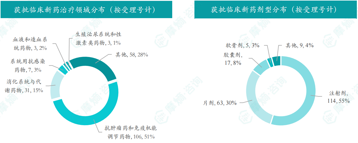 本月获批临床受理号数量最多的新药为抗肿瘤药和免疫机能调节药物,有106个,占比为51%,消化系统与代谢药物获批数量也比较多,有31个。获批剂型主要为注射剂与片剂,分别有114个,63个。
