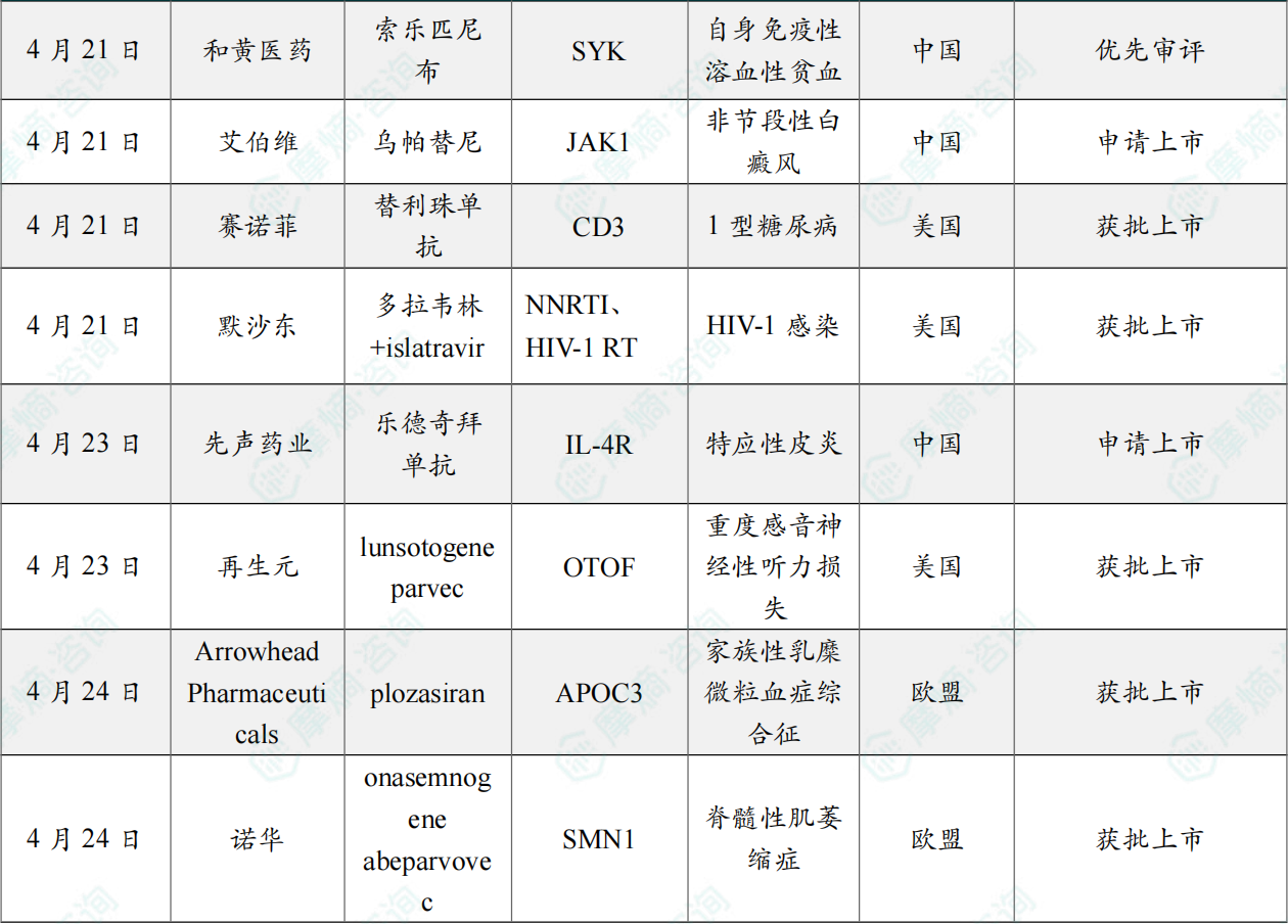 4月24日,Arrowhead Pharmaceuticals宣布,欧洲药品管理局人用药品委员会已采纳积极意见,建议批准Redemplo(plozasiran)上市。该药是一款小干扰RNA(siRNA)药物,拟作为饮食控制的辅助治疗,用于降低家族性乳糜微粒血症综合征(FCS)成年患者的甘油三酯水平。