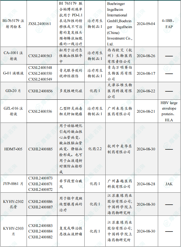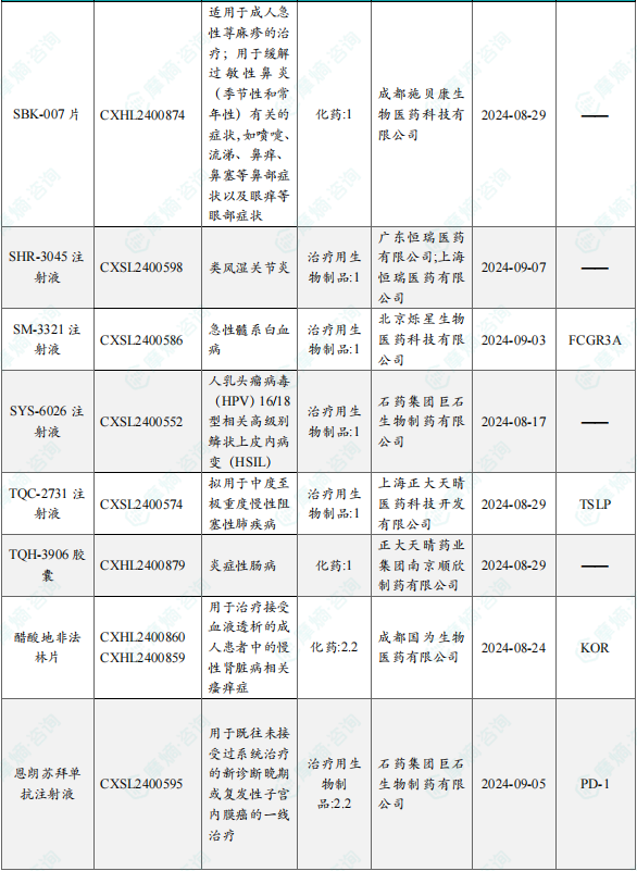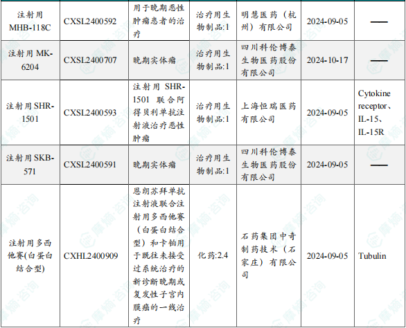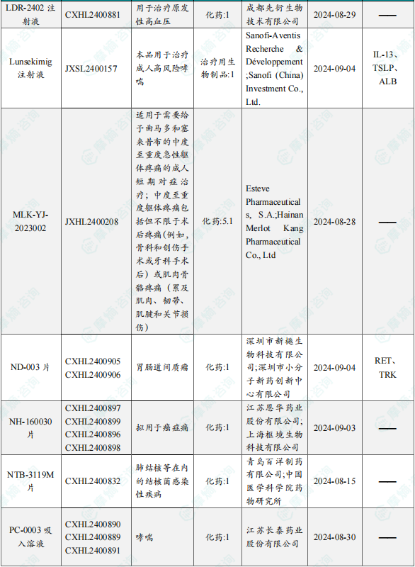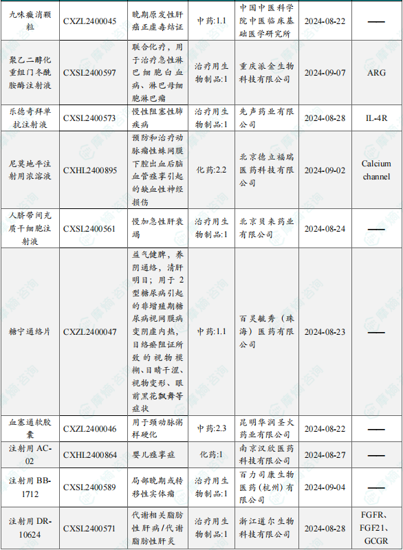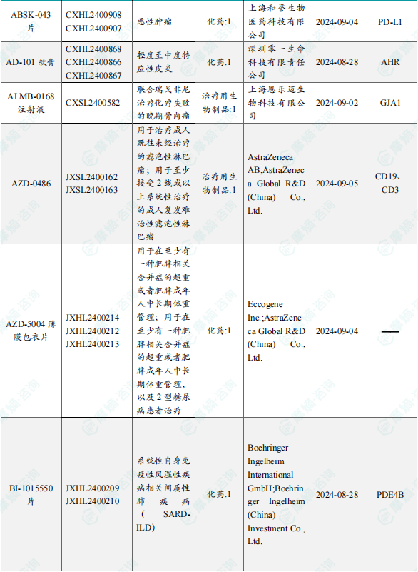 备注:(1)此处未包括补充申请之情形;(2)此处所列创新药/改良型新药,主要是指CDE受理批准的1类、2类、5.1类以及生物制品3.1类和3.2类。(3)更多获批临床信息及研发进展详情及相关靶点全局分析等,可通过摩熵中国药品审评数据库获取并下载EXCEL表格。