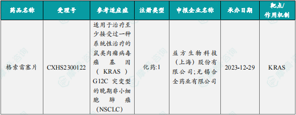 11月11日,国家药监局发布药品批准证明文件送达信息:益方生物的格索雷塞片获批上市,适用于治疗至少接受过一种系统性治疗的鼠类肉瘤病毒癌基因(KRAS)G12C突变型的晚期非小细胞肺癌(NSCLC)成人患者,为患者提供新的治疗选择。公开资料显示,格索雷塞片是国内首个自主研的KRAS G12C抑制剂。