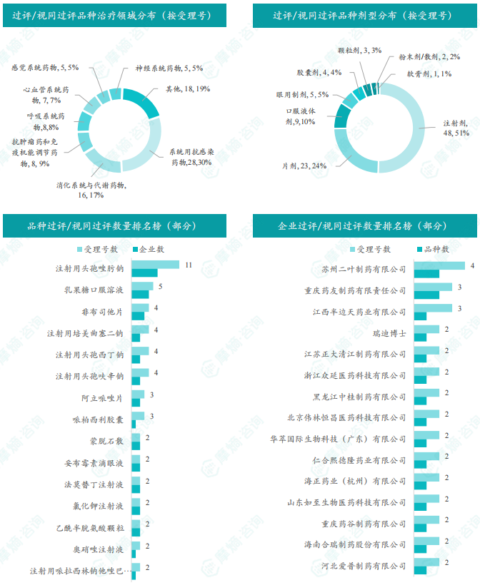 本周过评/视同过评品种主要为系统用抗感染药物,过评/视同过评产品剂型主要为注射剂;本周注射用头孢唑肟钠过评/视同过评受理号数量最多有11个,同时注射用头孢唑肟钠也是本周过评/视同过评企业数最多的品种有6家;本周苏州二叶制药有限公司和重庆药友制药有限责任公司企业过评/视同过评品种数最多有2种,其余各企业过评/视同过评品种数紧随其后,本周过评/视同过评企业共包括苏州二叶制药有限公司、重庆药友制药有限责任公司和江西半边天药业有限公司等69家企业。