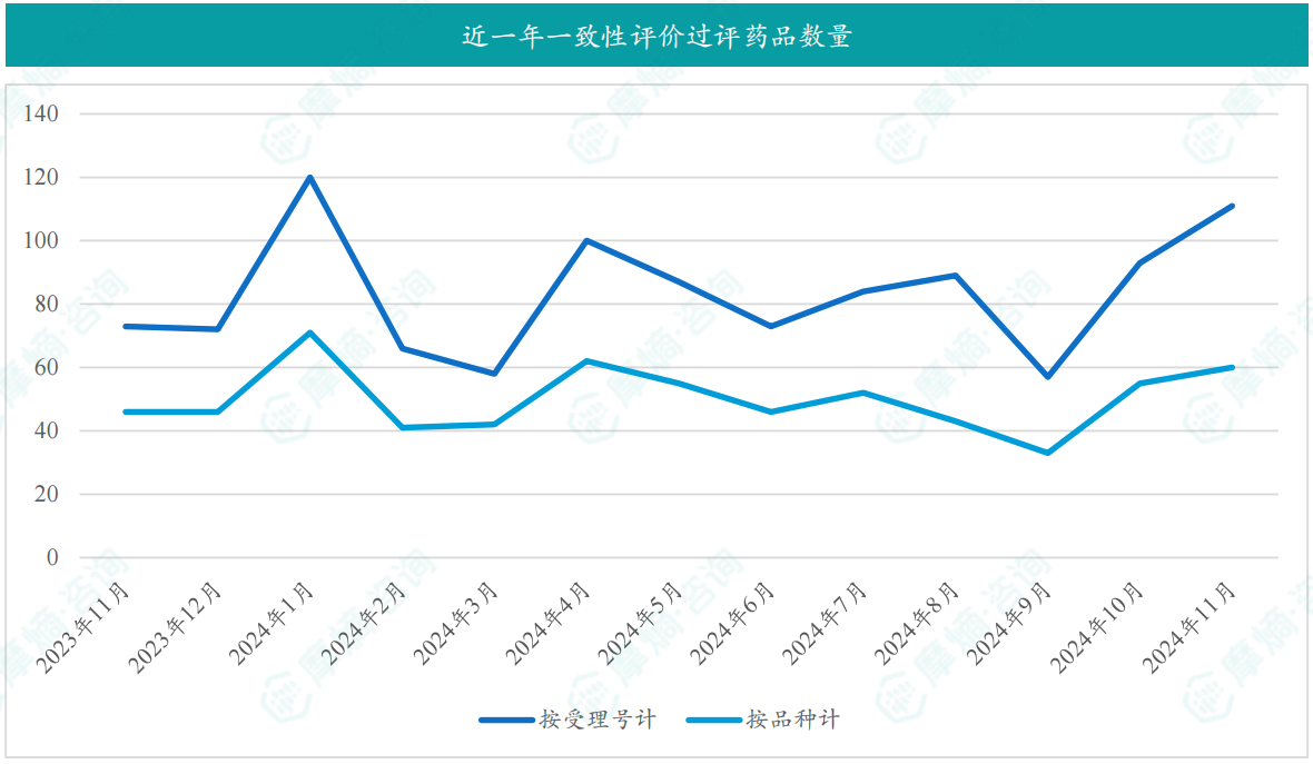 根据摩熵数据统计,2024年11月期间共有218个(共计392个受理号)品种通过/视同通过(新注册分类仿制药获批上市)一致性评价,其中一致性评价过评品种数量60个,视同通过一致性评价品种数量168个。
