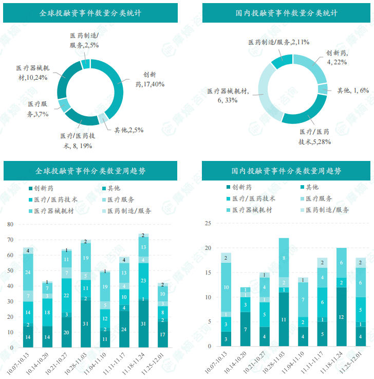 根据摩熵数据统计,2024.11.25-2024.12.01期间,全球医药大健康行业共发生投融资事件42起,较上次数量减少了32起,其中创新药类融资共17起,医疗器械耗材投资热度也较高,本周占比为24%,为10起。国内医药大健康行业共发生投融资事件18起,较上周数量减少了2起,其中其他、医疗/医药技术、医疗器械耗材、医药制造/服务融资事件分别发生1起、5起、6起、2起;其中宜明昂科、九源基因、奥创光子融资金额在1亿元人民币以上。本周国内创新药大类,抗肿瘤药物研发为热点。