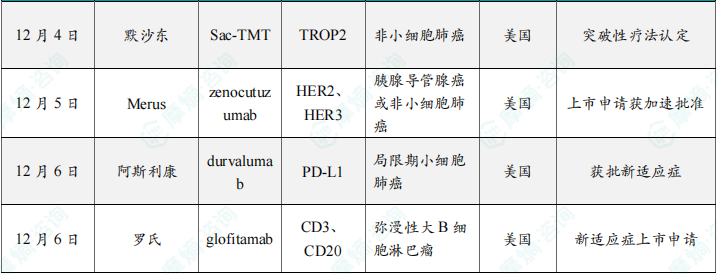 12月4日,恒瑞医药1类新药注射用SHR-A2102拟纳入突破性治疗品种,适应症为单药治疗既往含铂化疗和PD-(L)1抑制剂治疗失败的局部晚期或转移性尿路上皮癌。SHR-A2102为一款靶向Nectin-4的ADC,其有效载荷是拓扑异构酶抑制剂(TOPi)。此前,该产品用于治疗晚期实体瘤的临床试验申请已获得FDA许可。SHR-A2102单药或联合其他抗肿瘤治疗用于晚期实体瘤的临床试验申请也获得中国NMPA的许可,目前已进入2期临床试验阶段。