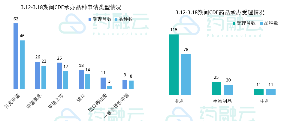 根据药融云中国药品审评数据,3月12号-3月18号期间共109个(按品种计,下同)药品获CDE承办,包括化药78个,生物制品20个,以及中药11个。