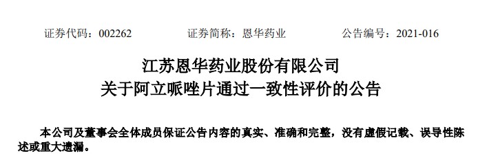3月18日,恩华药业公告,公司于近日收到国家药监局核准签发的关于“阿立哌唑片”的《药品补充申请批准通知书》,批准该药品通过仿制药质量和疗效一致性评价。