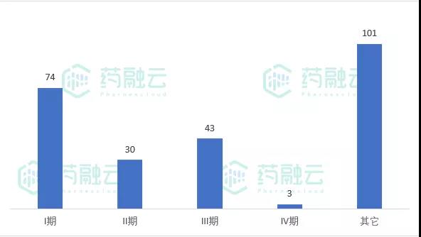 从临床分期来看,临床I期74项,临床II期30项(含I/II期),临床III期43项(含II/III期、I/II/III期), 临床IV期3项,其他试验101项(主要是BE试验)。