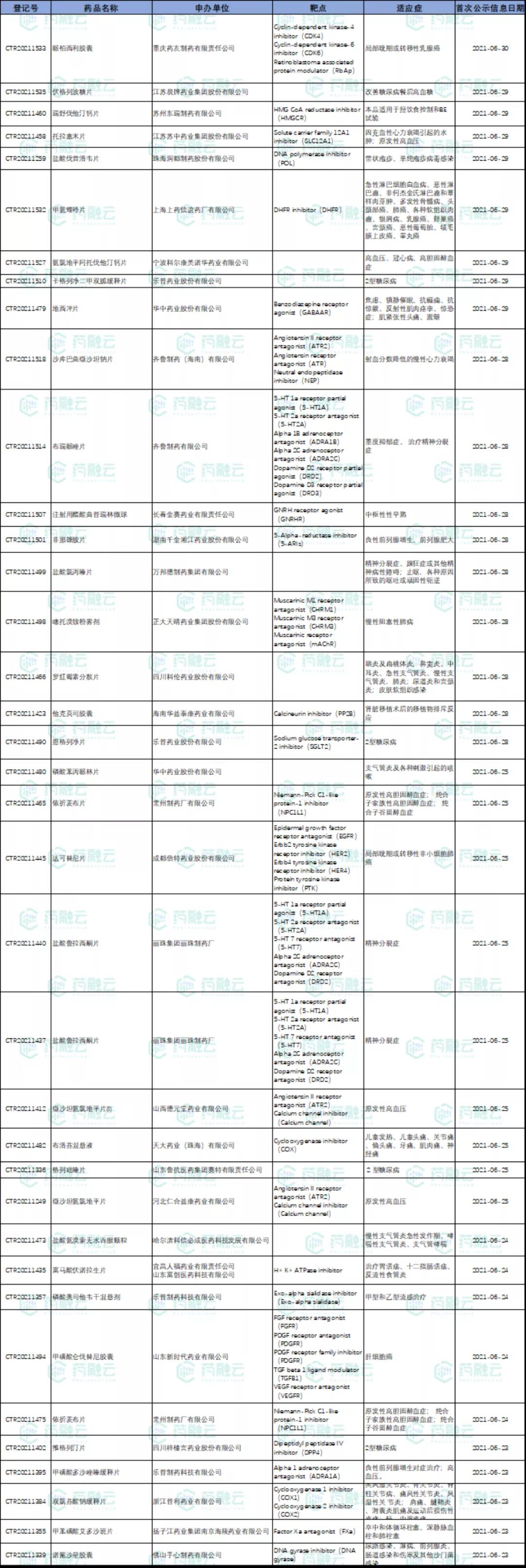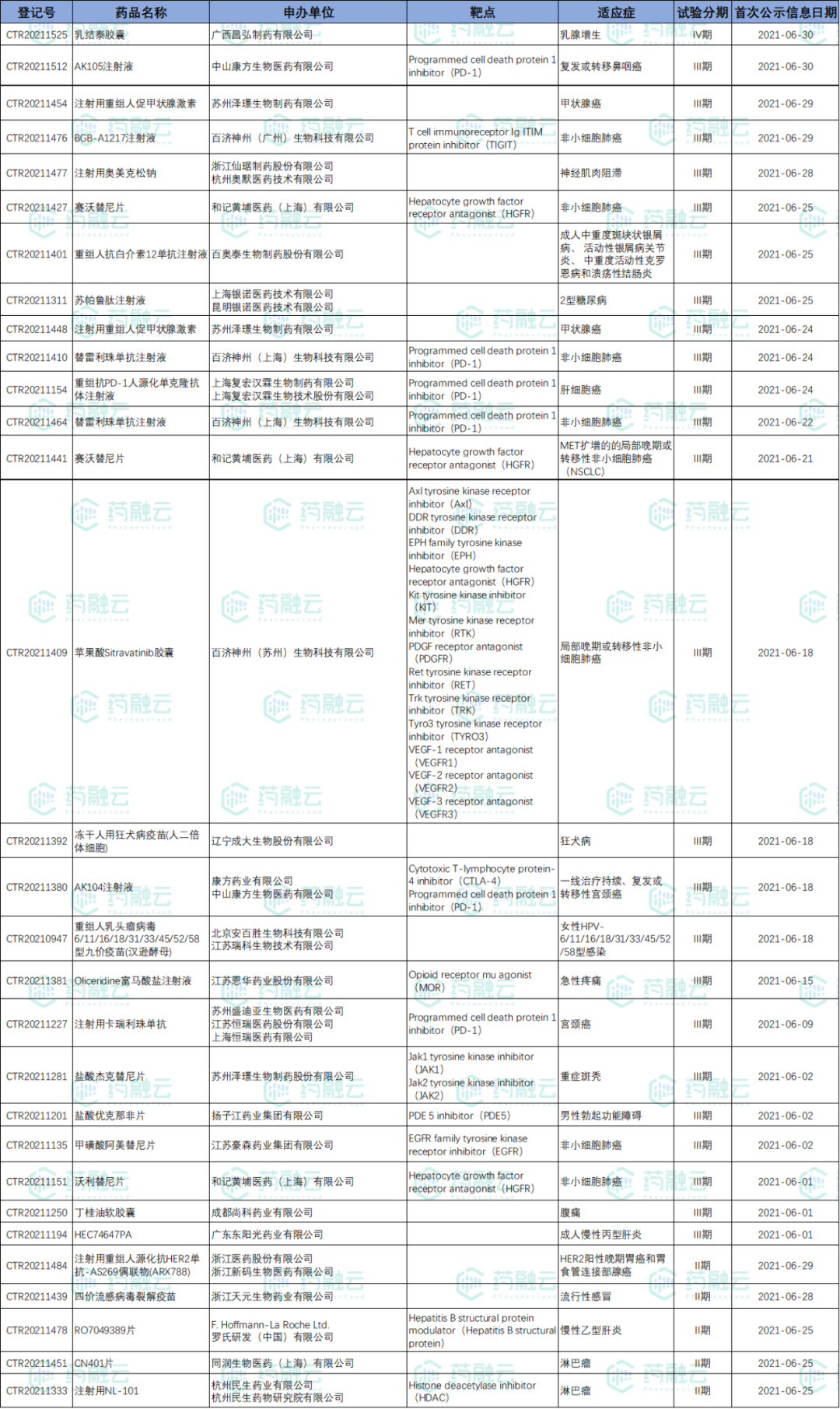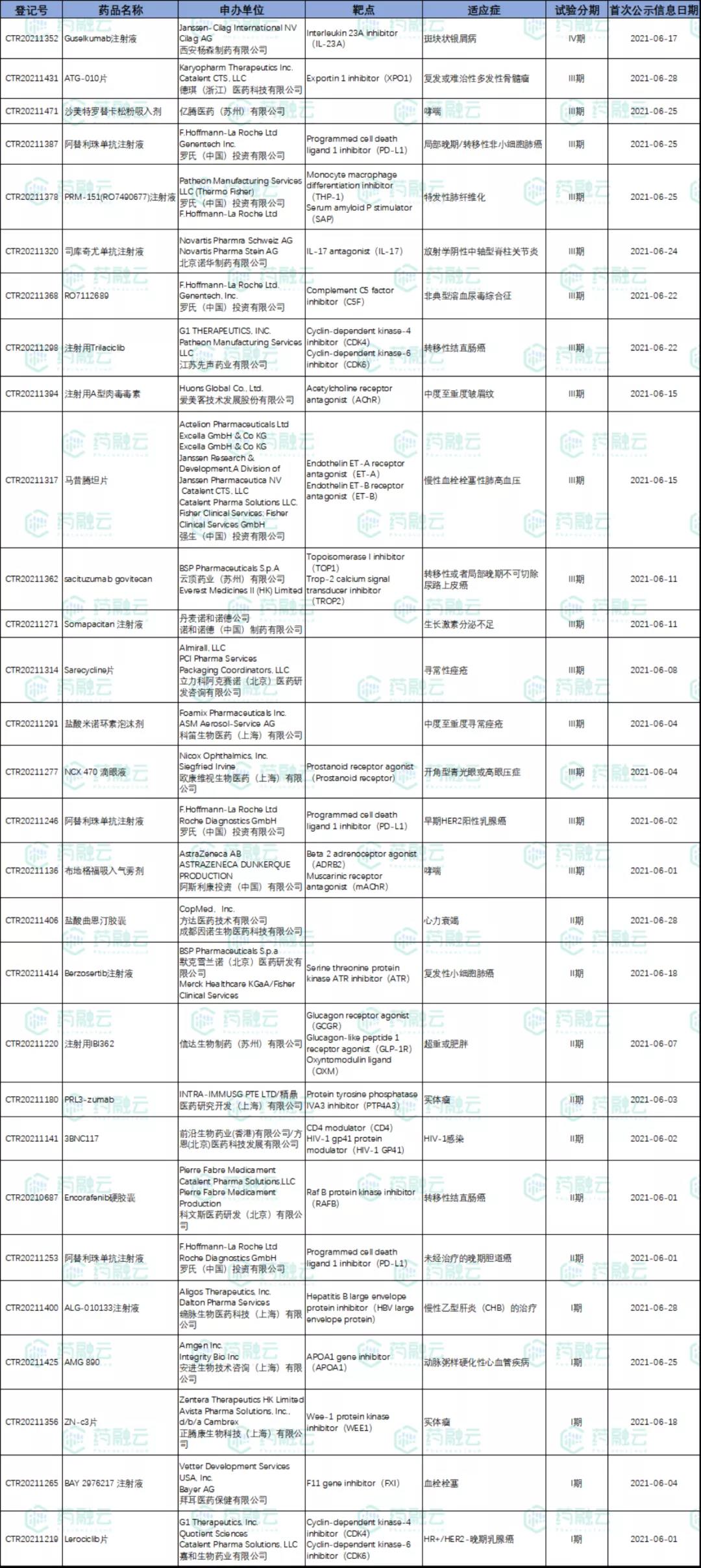 数据统计时间段为2021年6月1日-2021年6月30日,药融云将定期公示临床试验申报信息,关注我们即可定期查看。如有疏漏,欢迎指正!