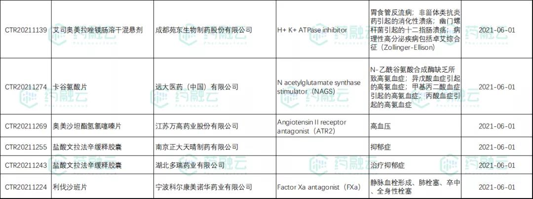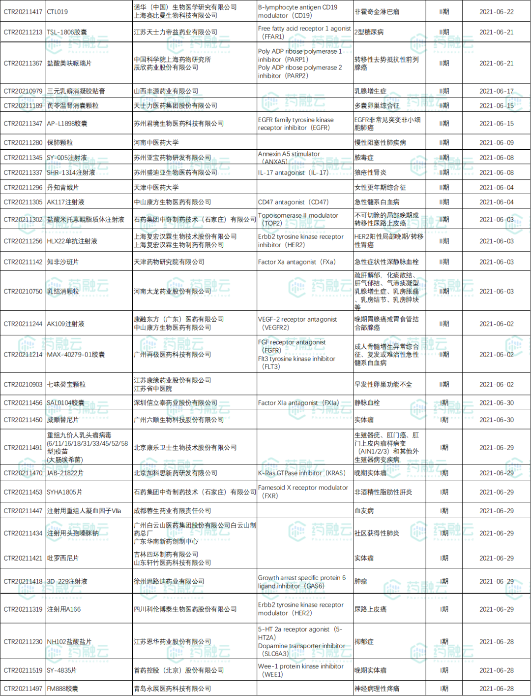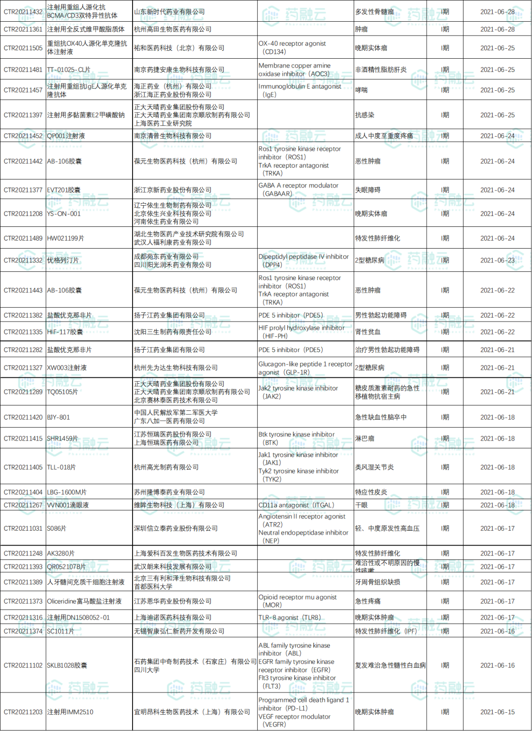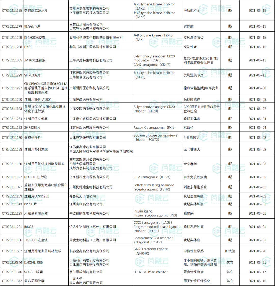 数据统计时间段为2021年6月1日-2021年6月30日,药融云将定期公示临床试验申报信息,关注我们即可定期查看。如有疏漏,欢迎指正!