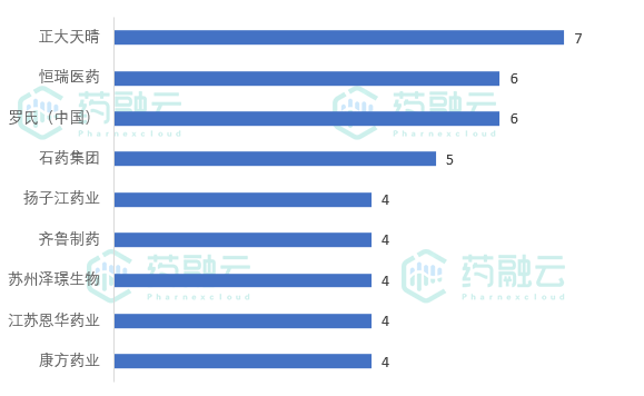 临床试验申办单位中,正大天晴以7项登记试验位居第一。恒瑞、罗氏紧随其后。