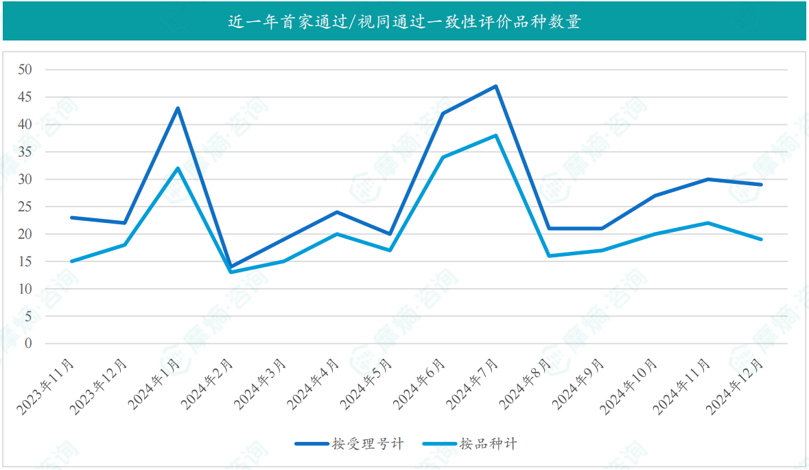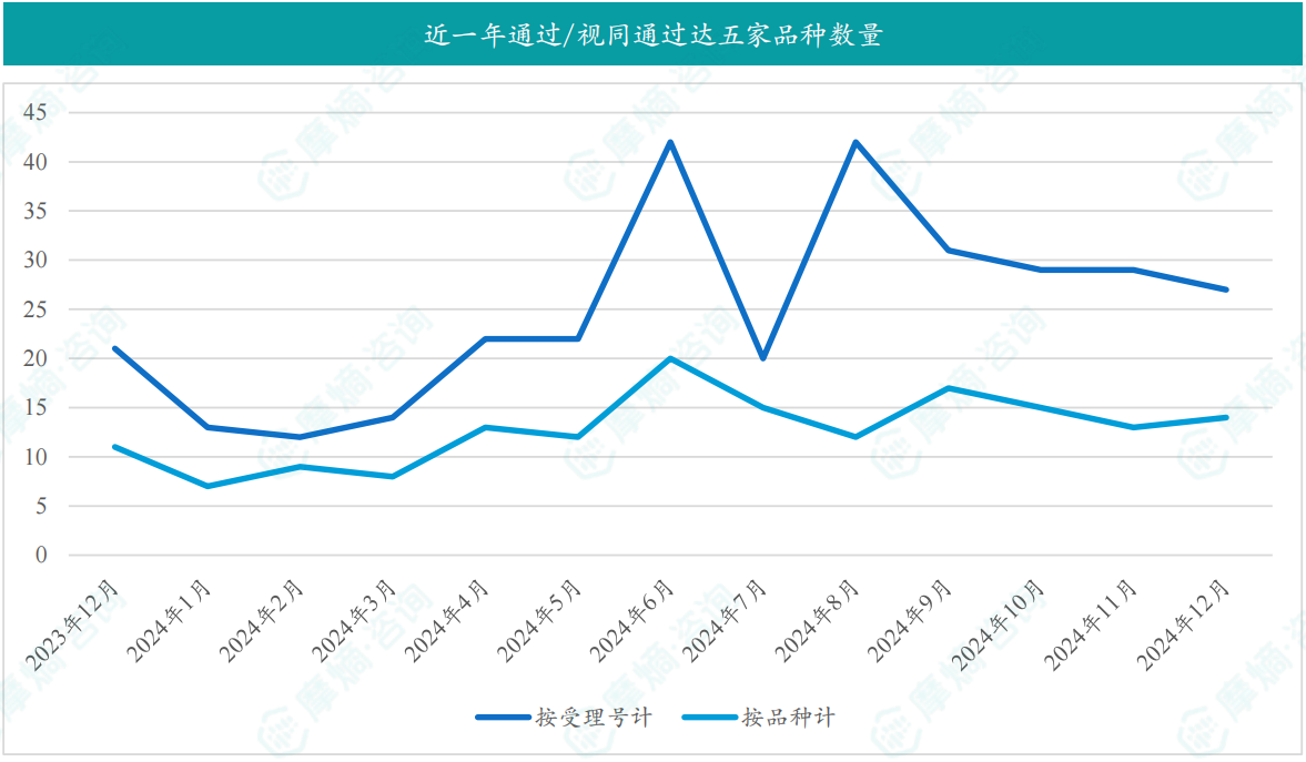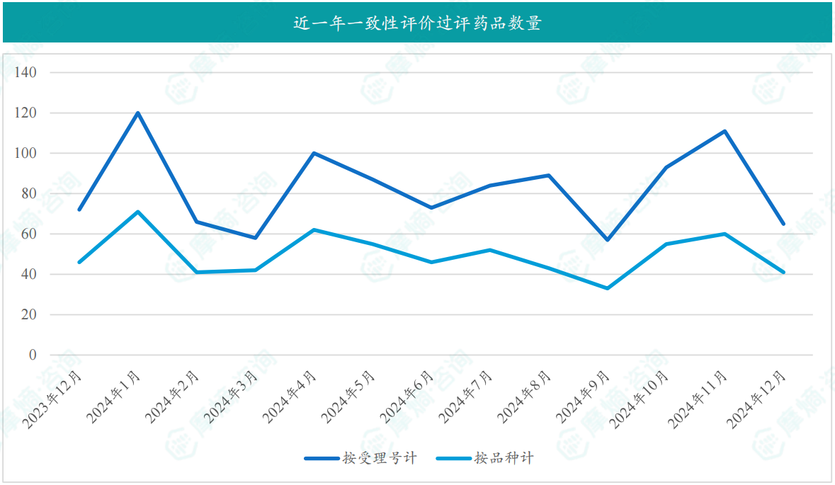 根据摩熵数据统计,2024 年12月期间共有 223 个(共计 381 个受理号)品种通过/视同通过(新注册分类仿制药获批上市)一致性评价,其中一致性评价过评品种数量41个,视同通过一致性评价品种数量189个。