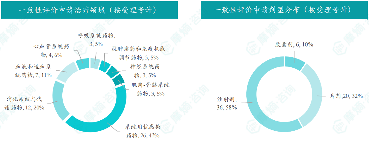 根据摩熵数据统计,2024年12月共有43个品种(按受理号计 62 项)一致性评价申请获CDE承办,申请品种主要为系统用抗感染药物,申请剂型主要为注射剂。