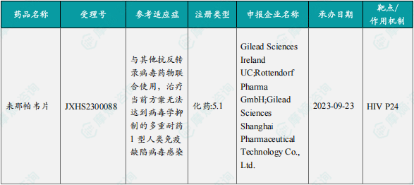 1月2日,国家药监局发布药品批准证明文件送达信息:吉利德的那帕韦片和来那帕韦注射液获批上市,用于与其他抗反转录病毒药物联合使用,治疗当前方案无法达到病毒学抑制的多重耐药1型人类免疫缺陷病毒(HIV-1)感染的成人患者。公开资料显示,那帕韦是一款HIV-1衣壳抑制剂,将为对现有疗法无有效应答的HIV感染者提供一种每年仅需给药两次的全新治疗方案,主要是通过破坏艾滋病病毒的衣壳,使病毒复制不能完成。这个药物在体内代谢很慢,有效治疗浓度可以维持长达26周。