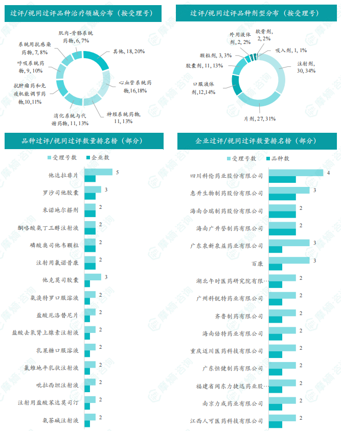 本周他达拉非片过评/视同过评受理号数量最多有5个,本周他达拉非片、罗沙司他胶囊和酮咯酸氨丁三醇注射液等多个品种过评/视同过评企业数达2家;