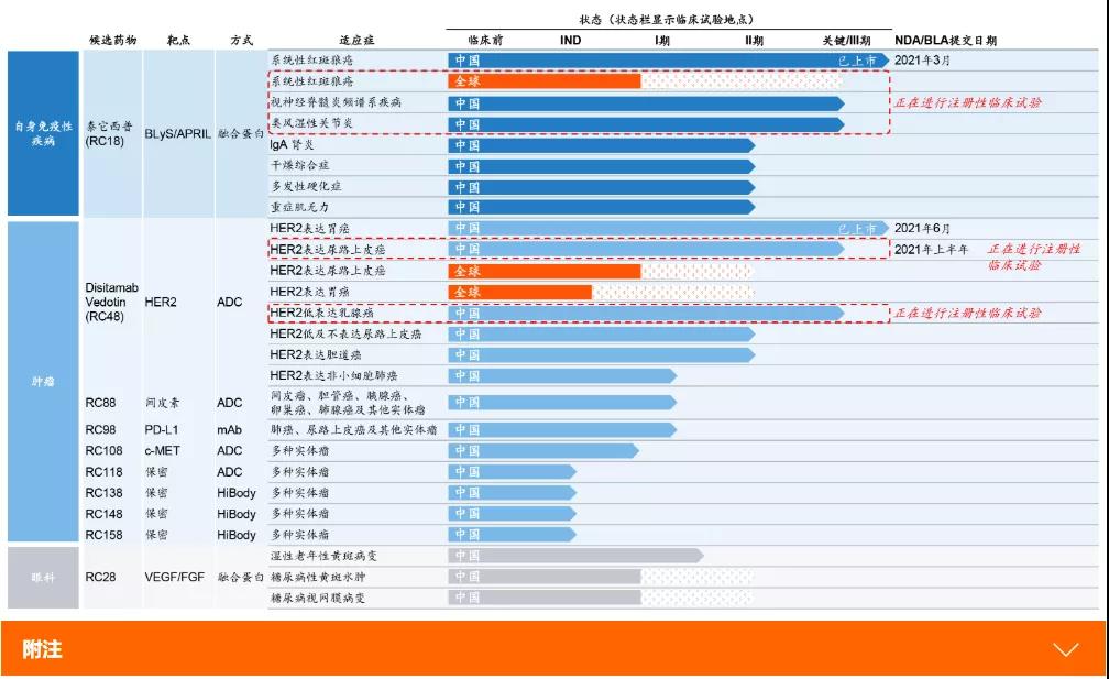 此前已有研发的ADC药物分别为:2021年6月9日上市的HER2靶点药物纬迪西妥单抗(RC48)、处于临床一期的间皮素药物RC88和c-MET的RC118。