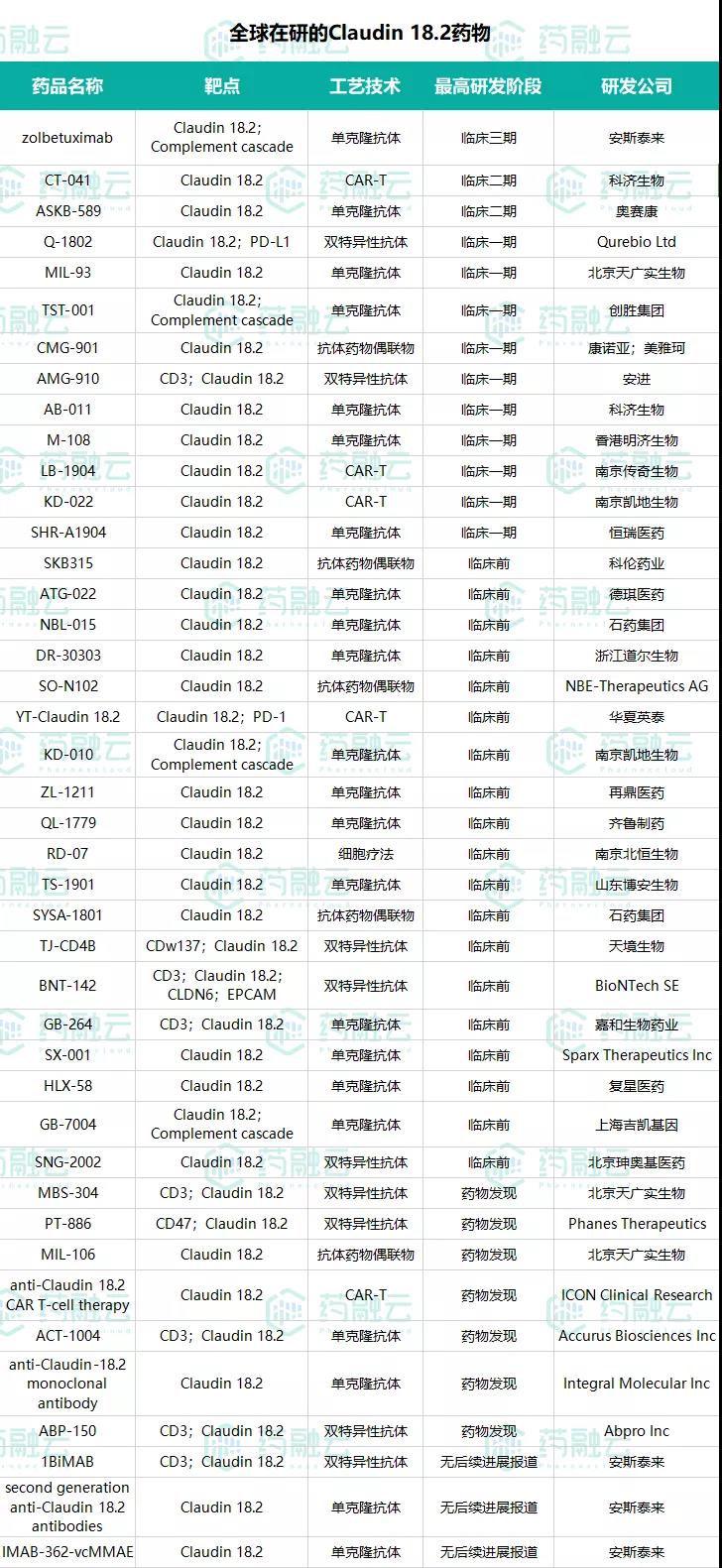 全球在研的Claudin 18.2药物