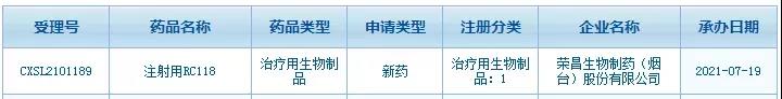 2021年7月19日,荣昌生物第4款ADC(抗体偶联药物)新药RC118的临床试验申请获得NMPA受理 。