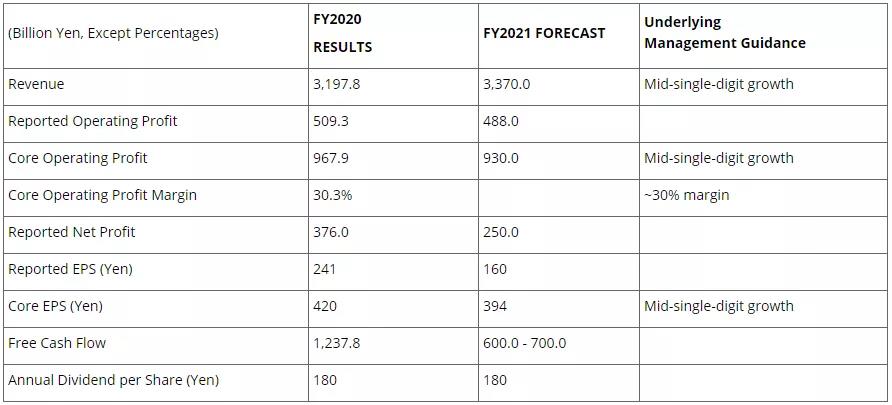 武田制药还公布了2021财年业绩指引,公告指出,武田在 2021 财年拥有强劲的增长势头,预计在武田14个全球品牌的持续推动下,潜在收入增长将加速至“个位数”。报告收入预计为3.37万亿日元,同比增长1722亿日元或较2020财年增长5.4%,基本收入势头和在日本出售糖尿病组合的一次性收益完全抵消了2020 财年资产剥离的影响。(肥东县海森医药3.22亿美元收购武田中国大陆非核心业务)