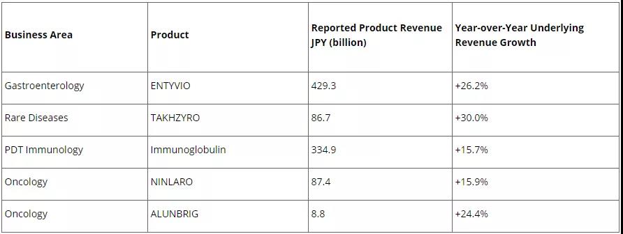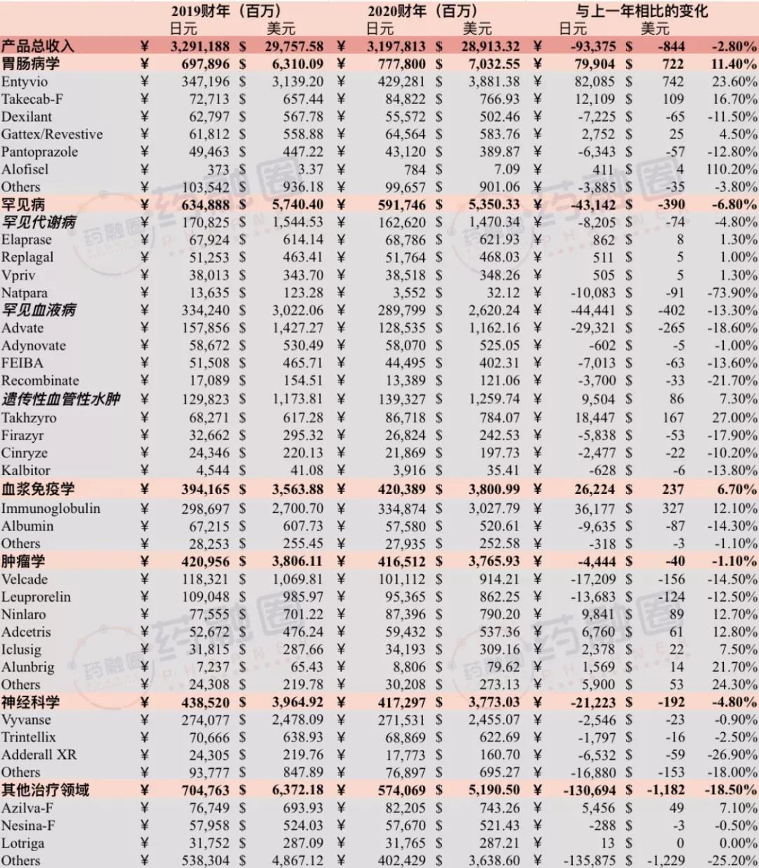 武田有五大关键治疗领域,包括胃肠病学、罕见病、血液制品、肿瘤和神经科学,五个关键领域的列报收入为26237亿日元(约合237亿美元),约占2020财年总收入的82%,基础营收同比增长4.7%。按照治疗领域分,具体产品业绩如下: